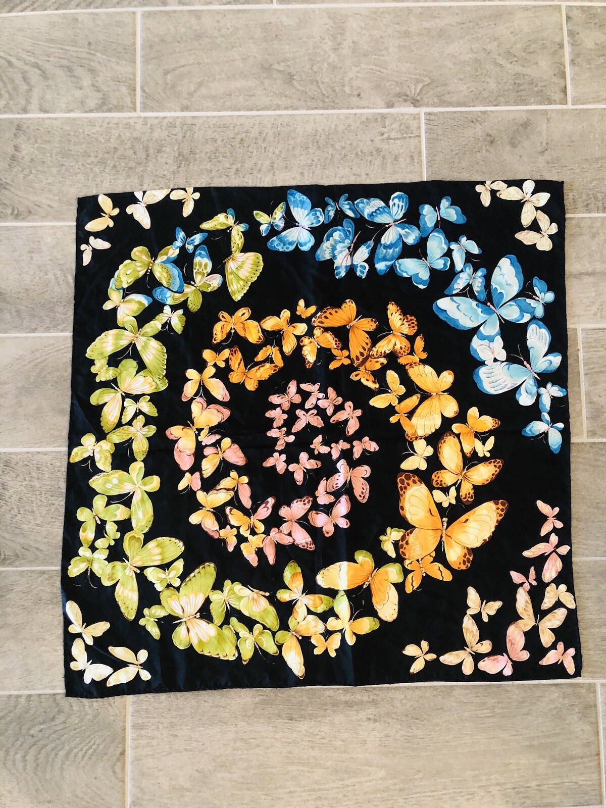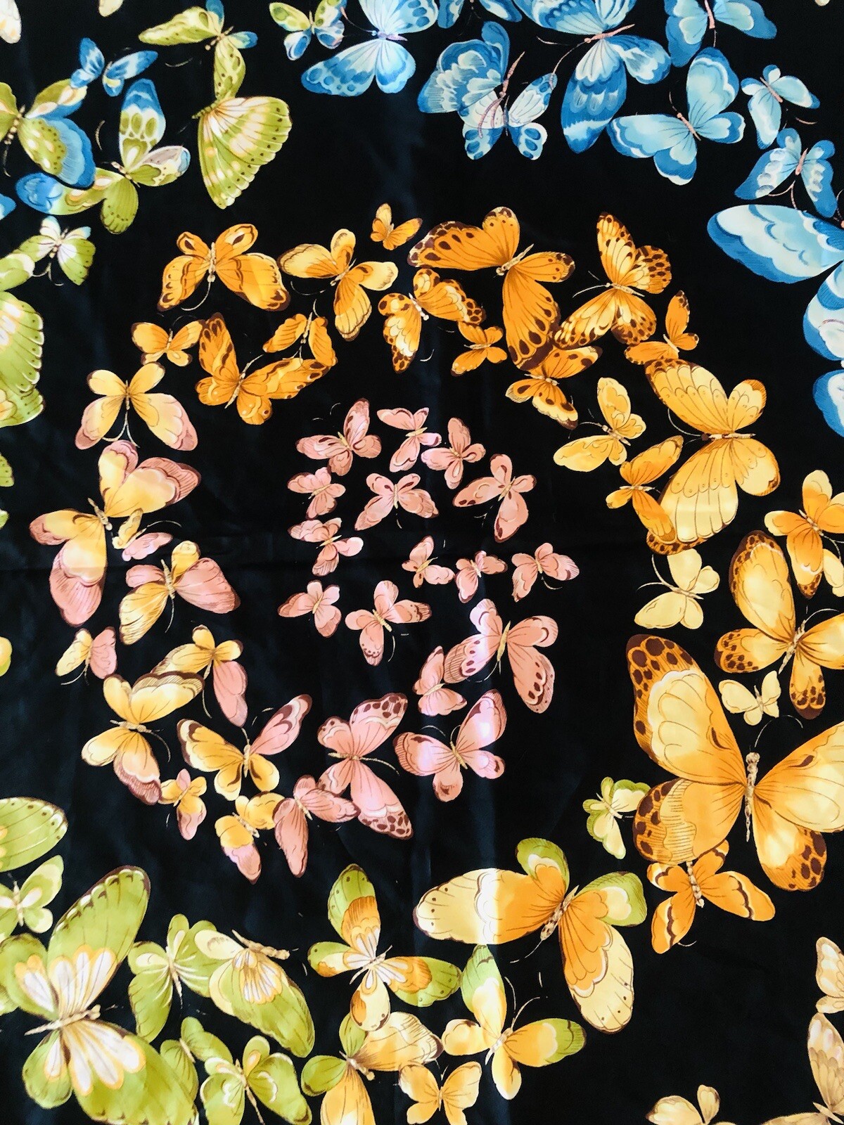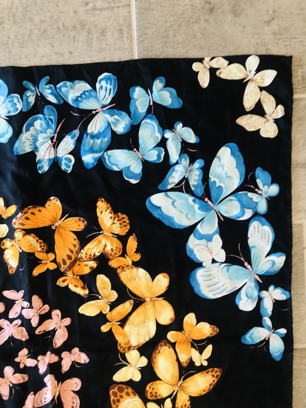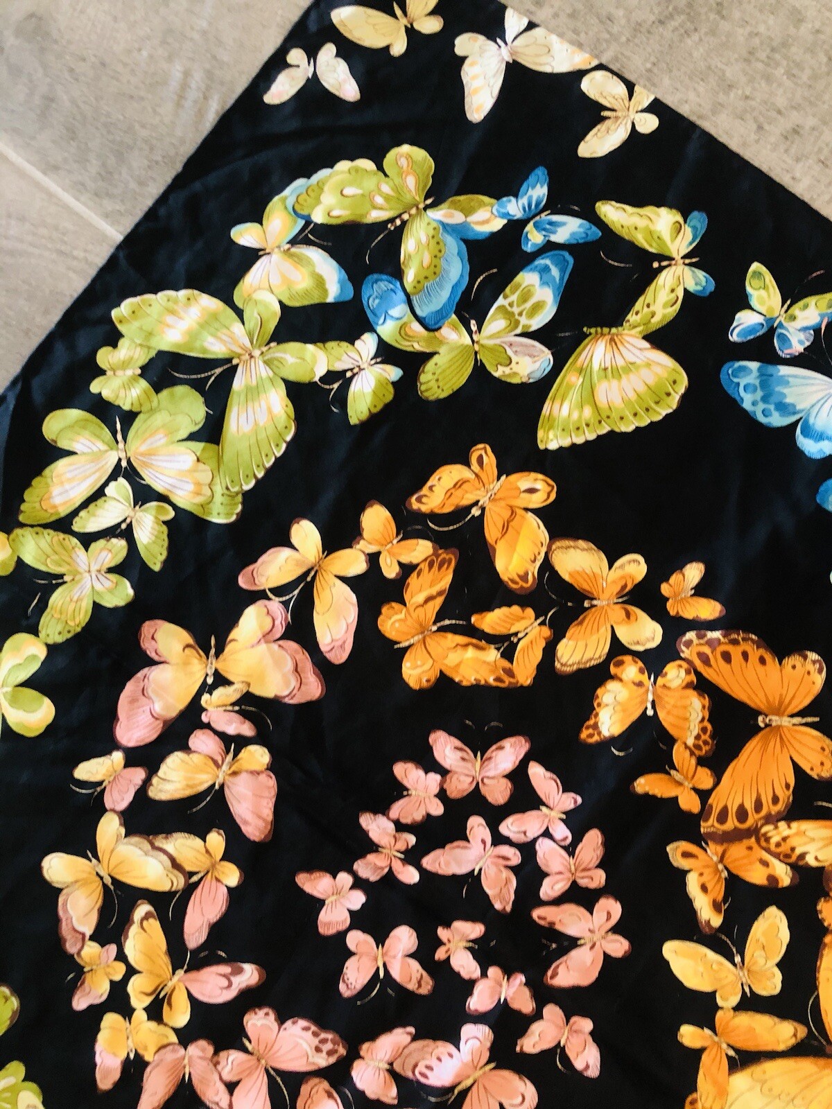 как выглядит Vintage 100 Silk multicolor Butterflies on Black Scarf Hand Rolled Edges 26 фото