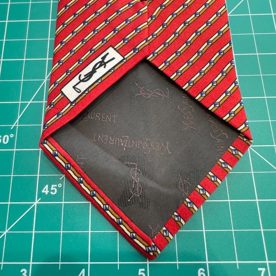 как выглядит YVES SAINT LAURENT YSL Tie Vtg Luxury Silk Red Stripe dot Logo Necktie 55" фото