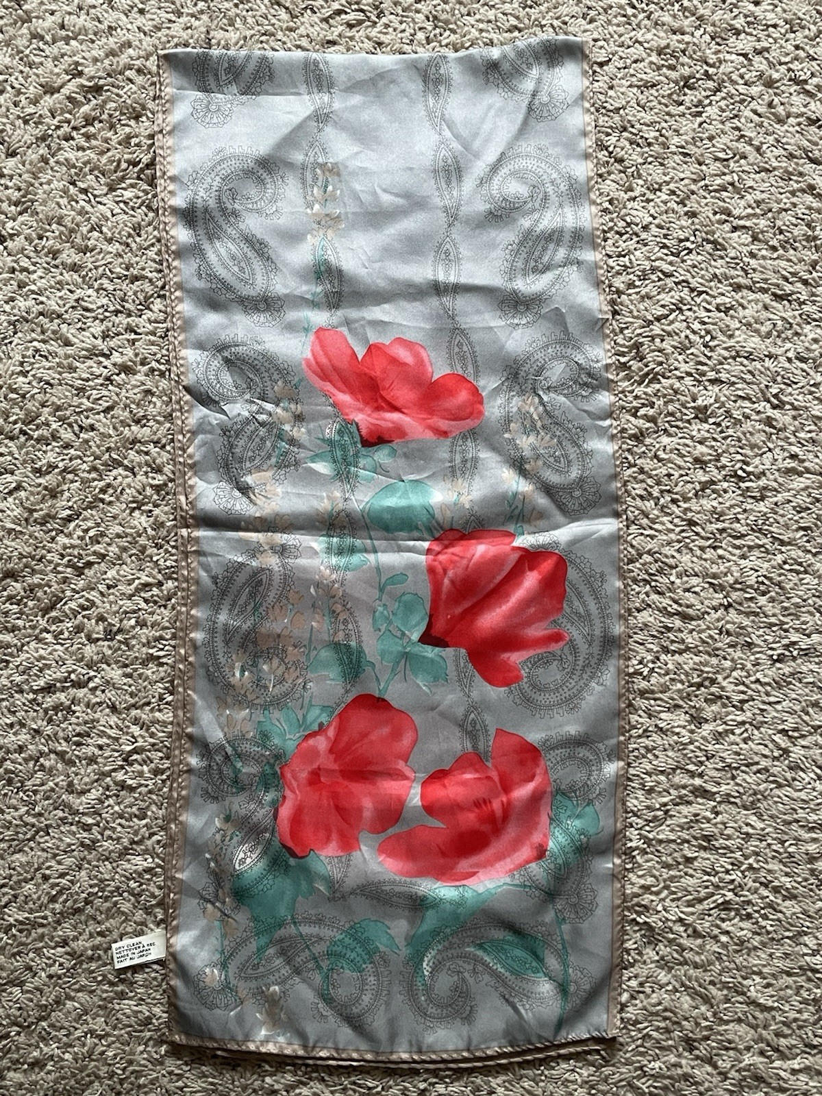 Vintage Vera Neumann 100 Silk Scarf Gray Paisley Red Flowers 52 x 11 JAPAN