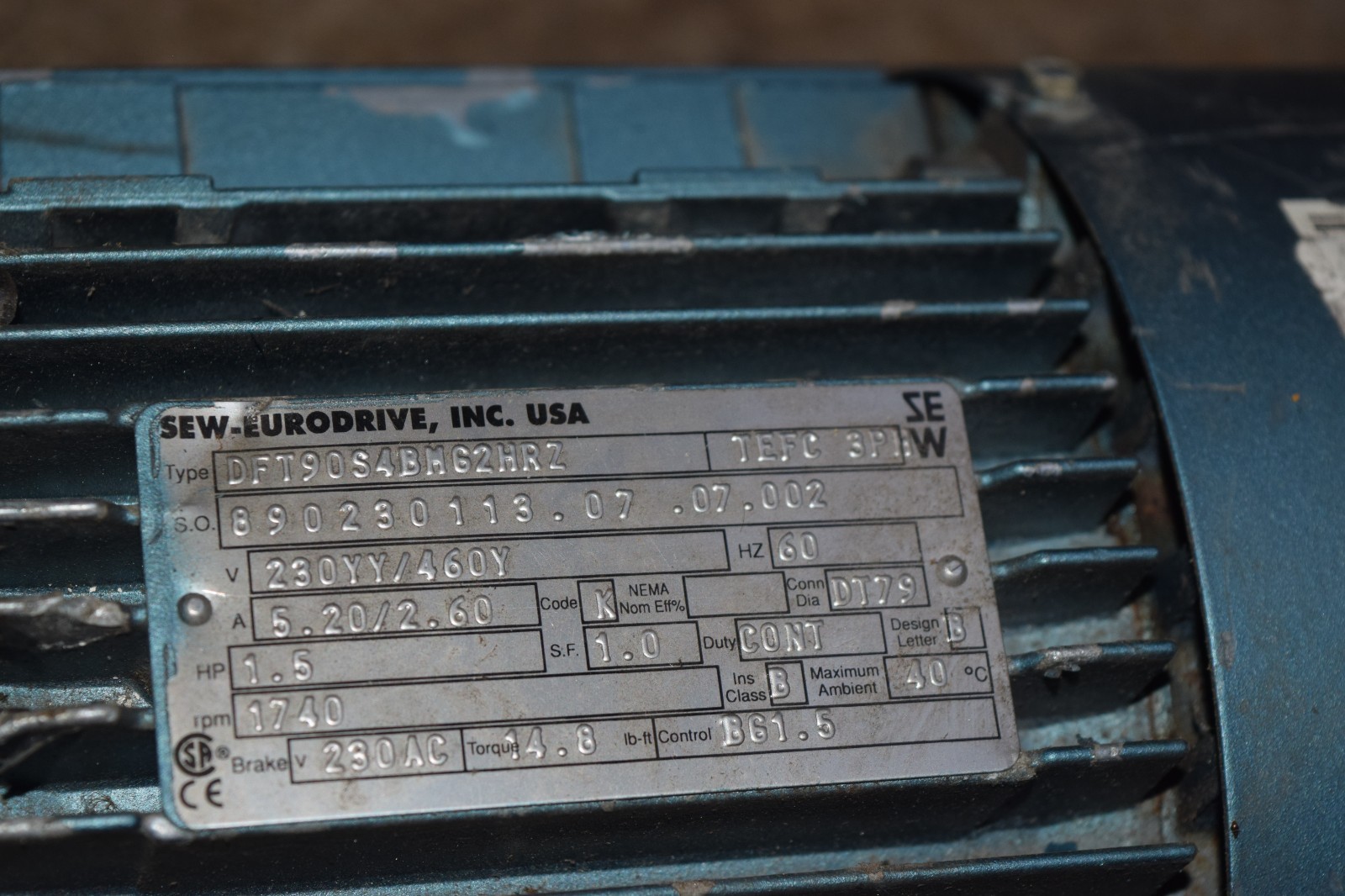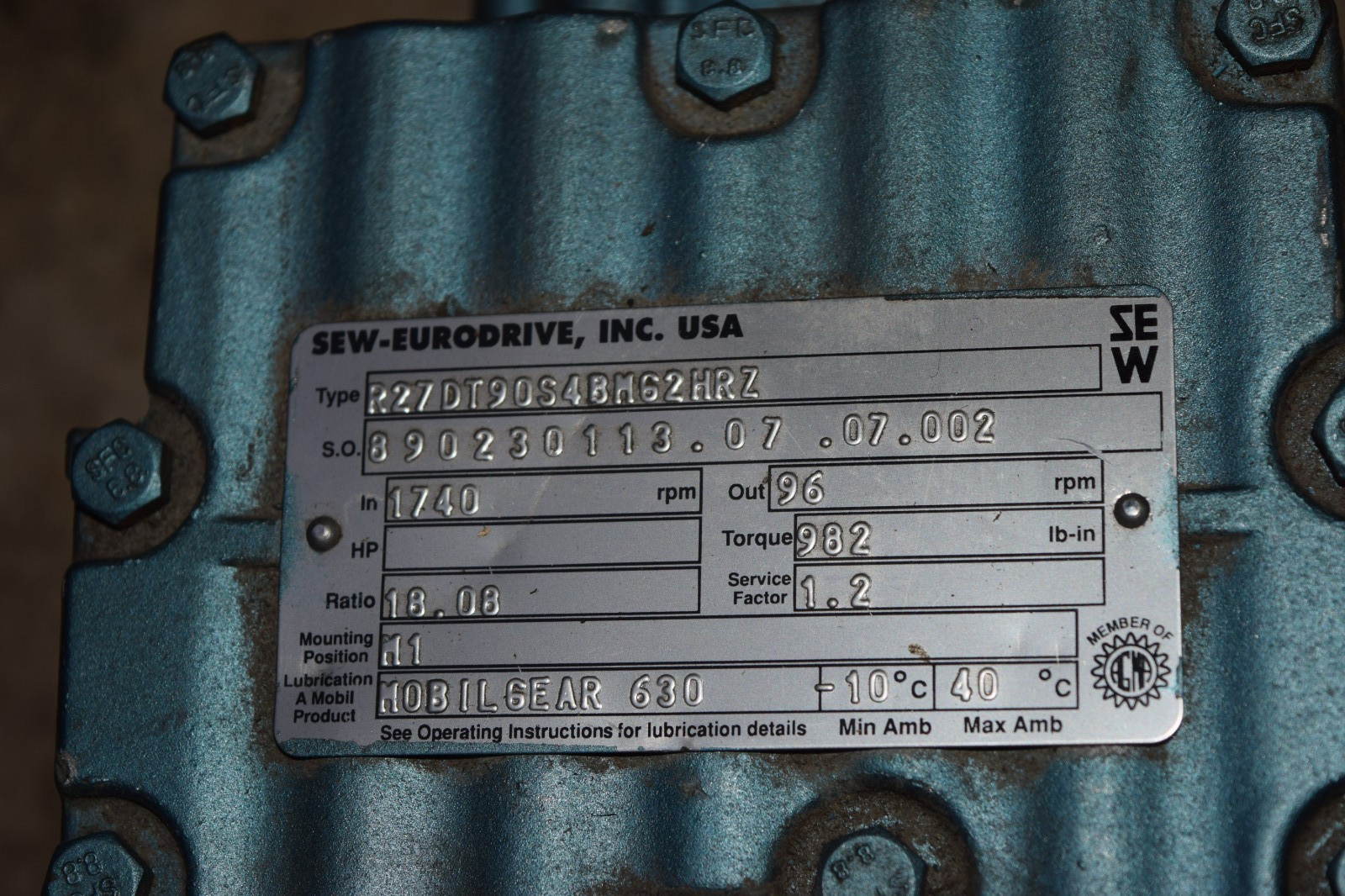 Sew-Eurodrive DFT90S4BM62HRZ R27DT90S4BM62HRZ Gear Motor Gearmotor Ratio 18.08