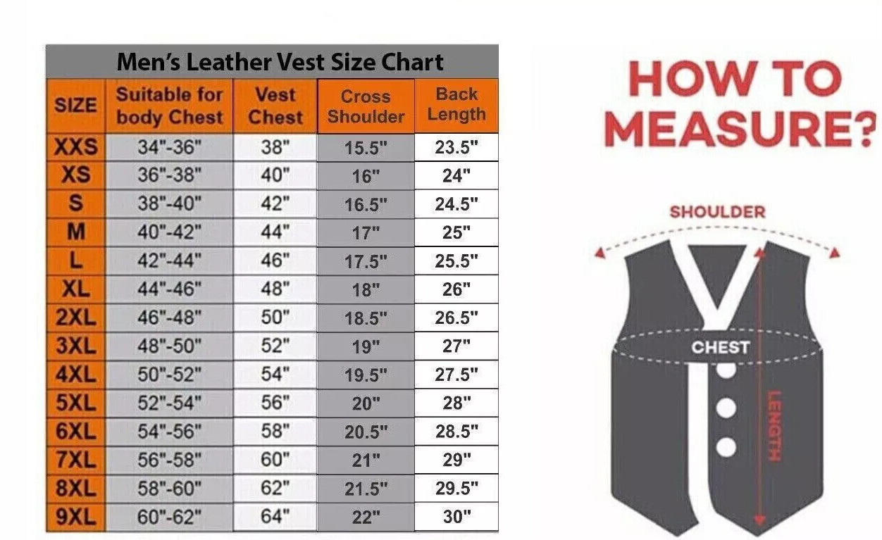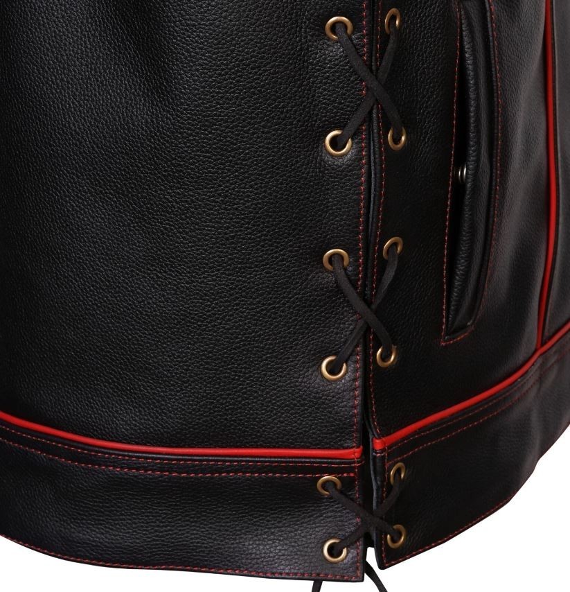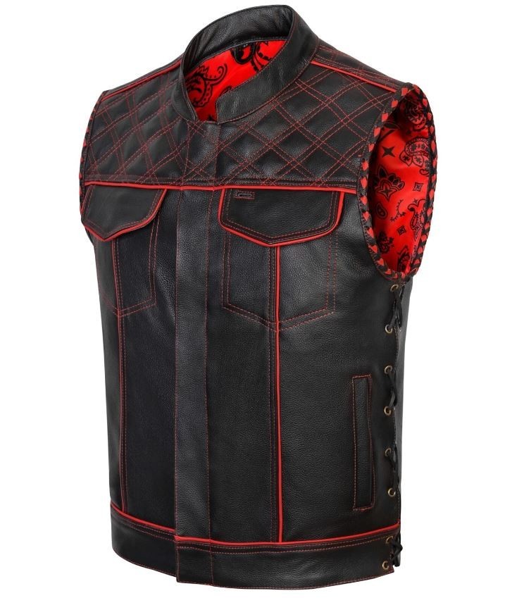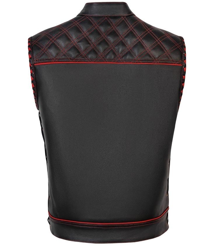 Men Black Leather Motorcycle Vest Diamond Stitch Biker Waistcoat - Red Lining