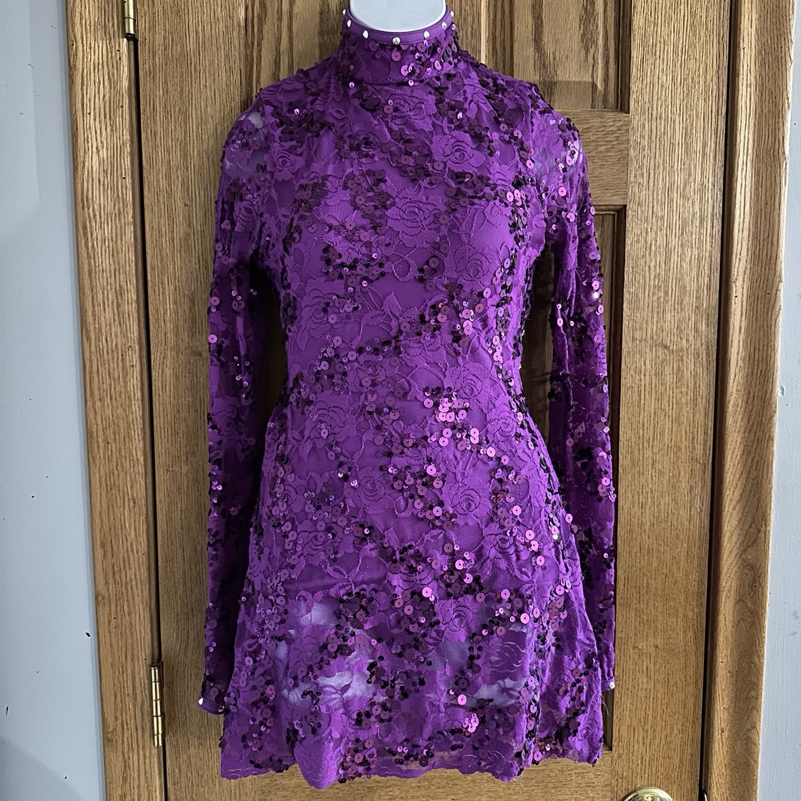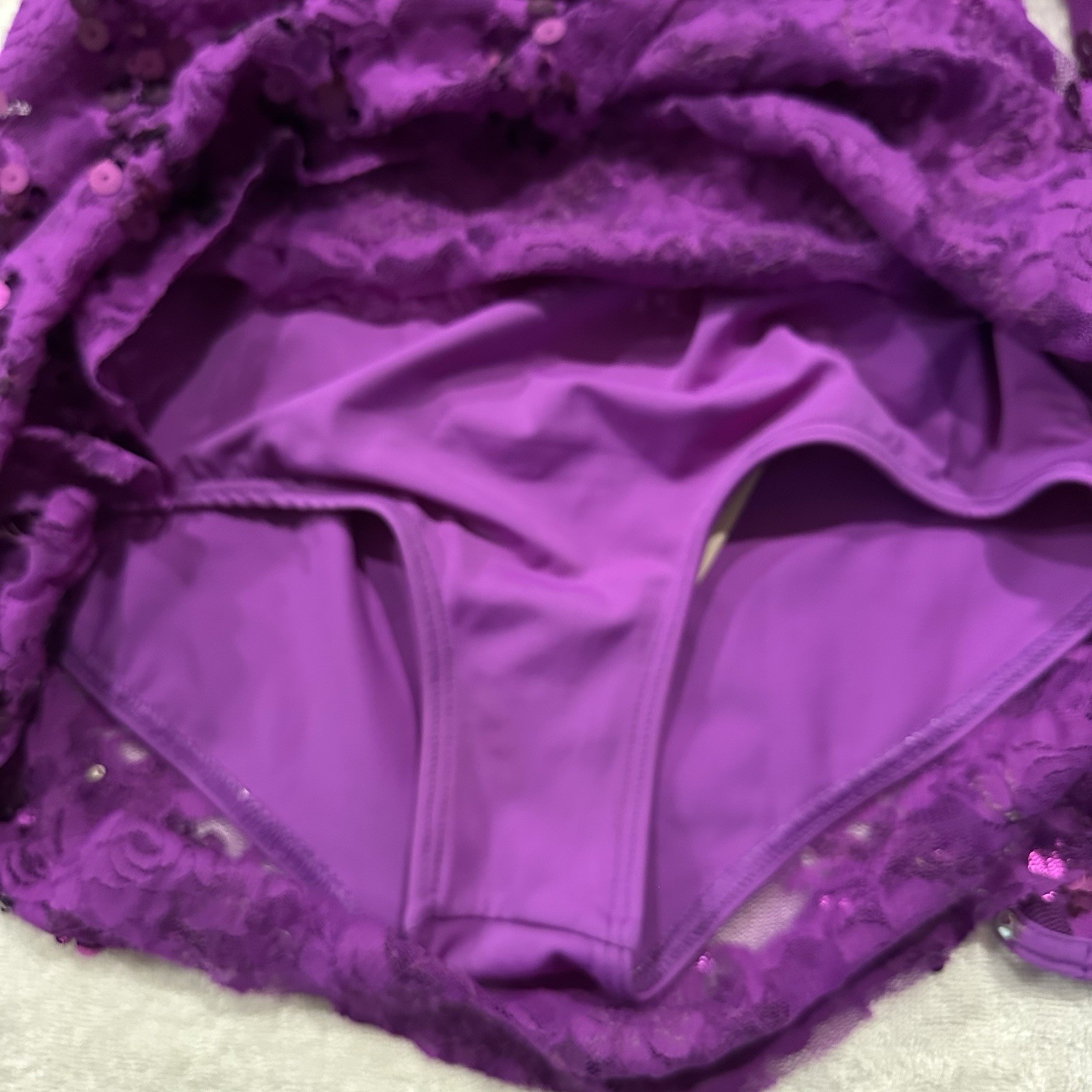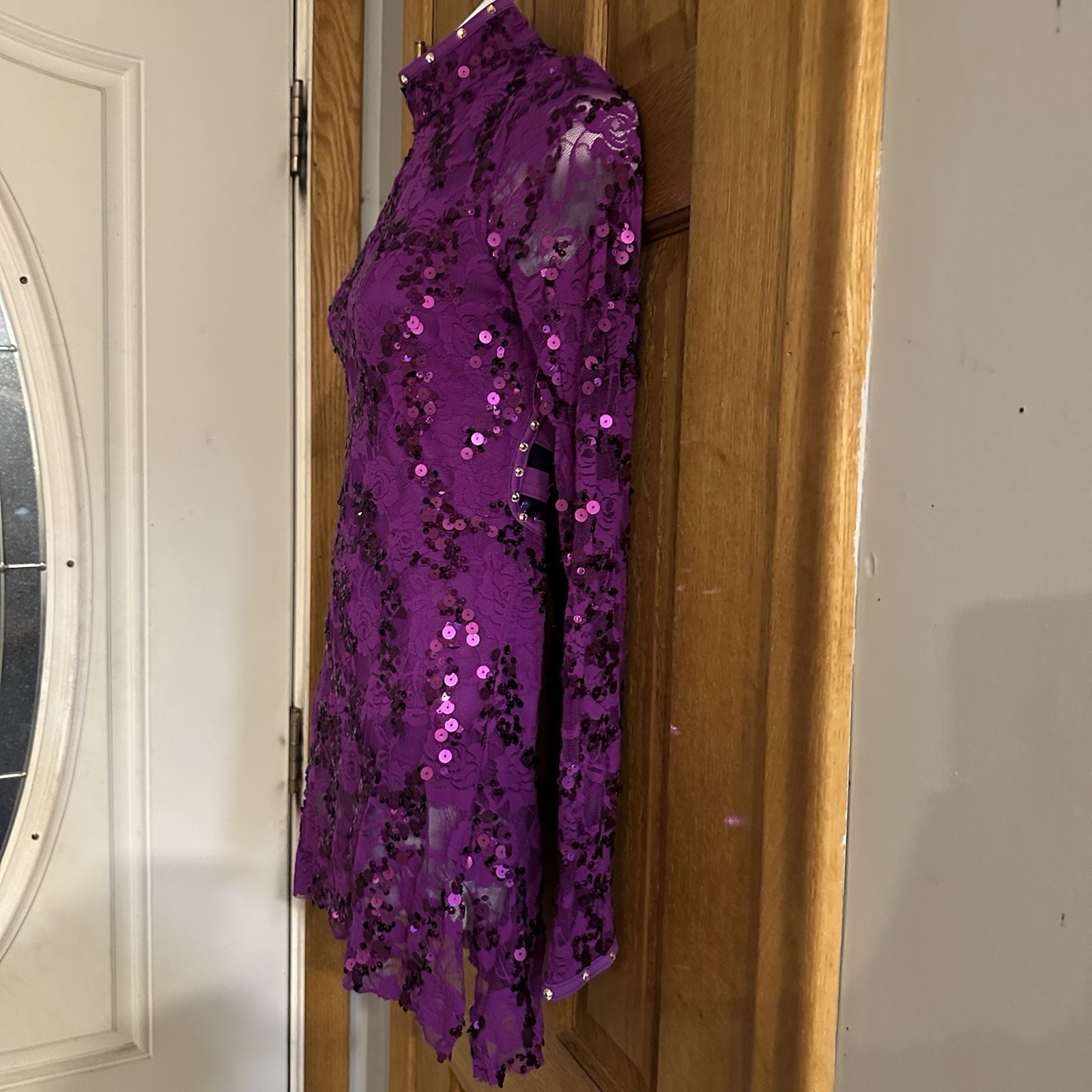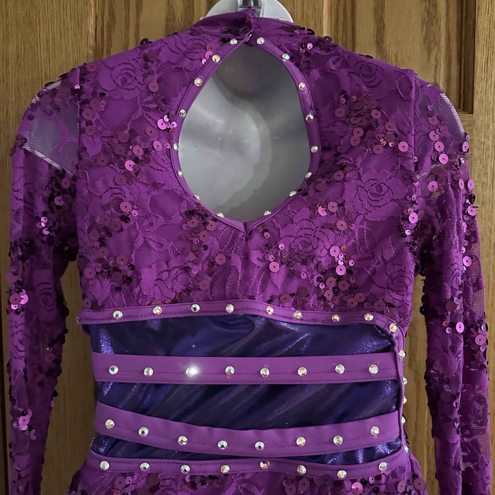 как выглядит Balera Semi Custom Purple Streak Lace Mock Neck Dress Rhinestone Dance Costume фото