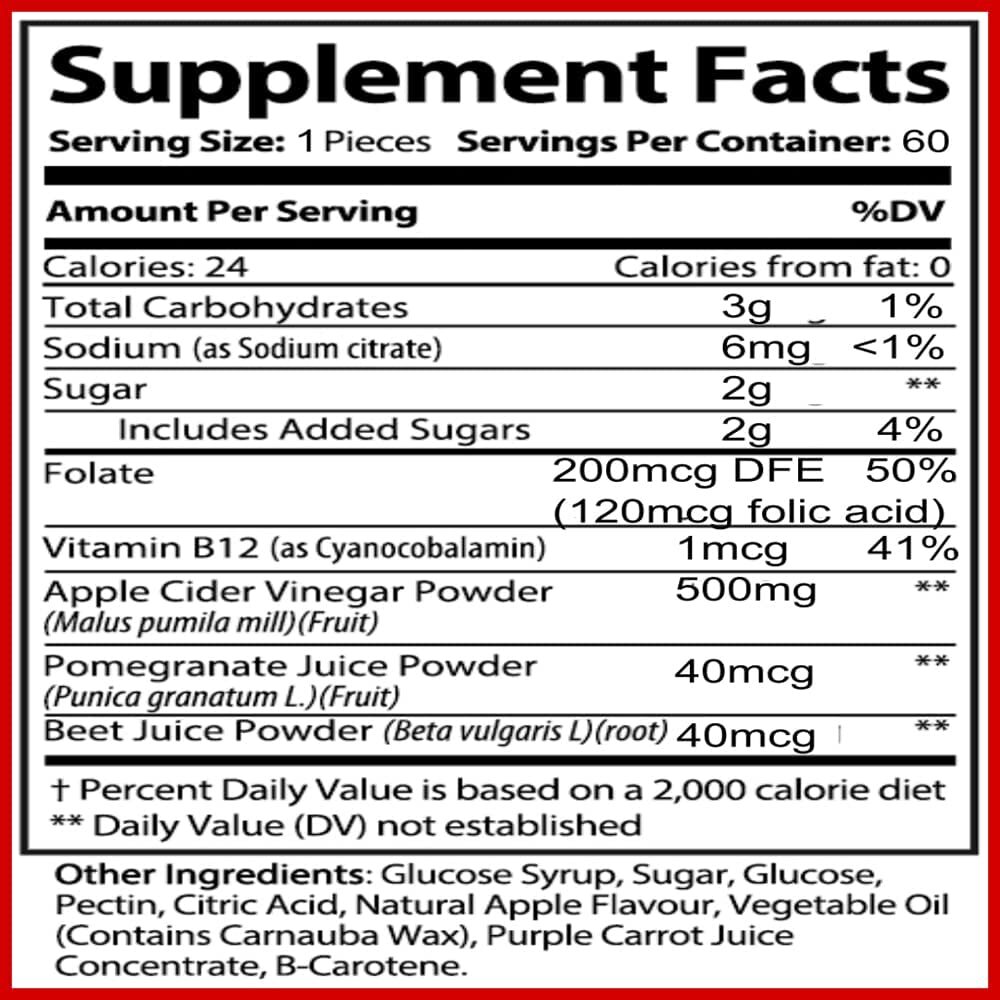 Active Ingredients: Pomegranate, Vitamin B12, Apple Cider Vineger, Vitamin B9 (Folate), Beet Juice