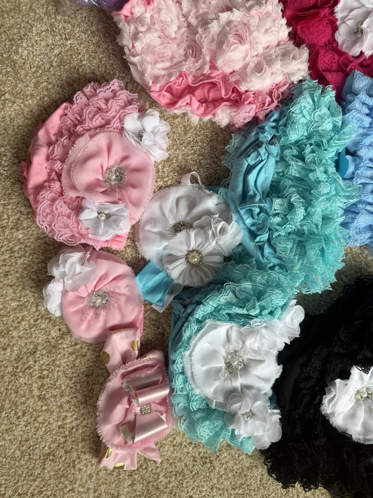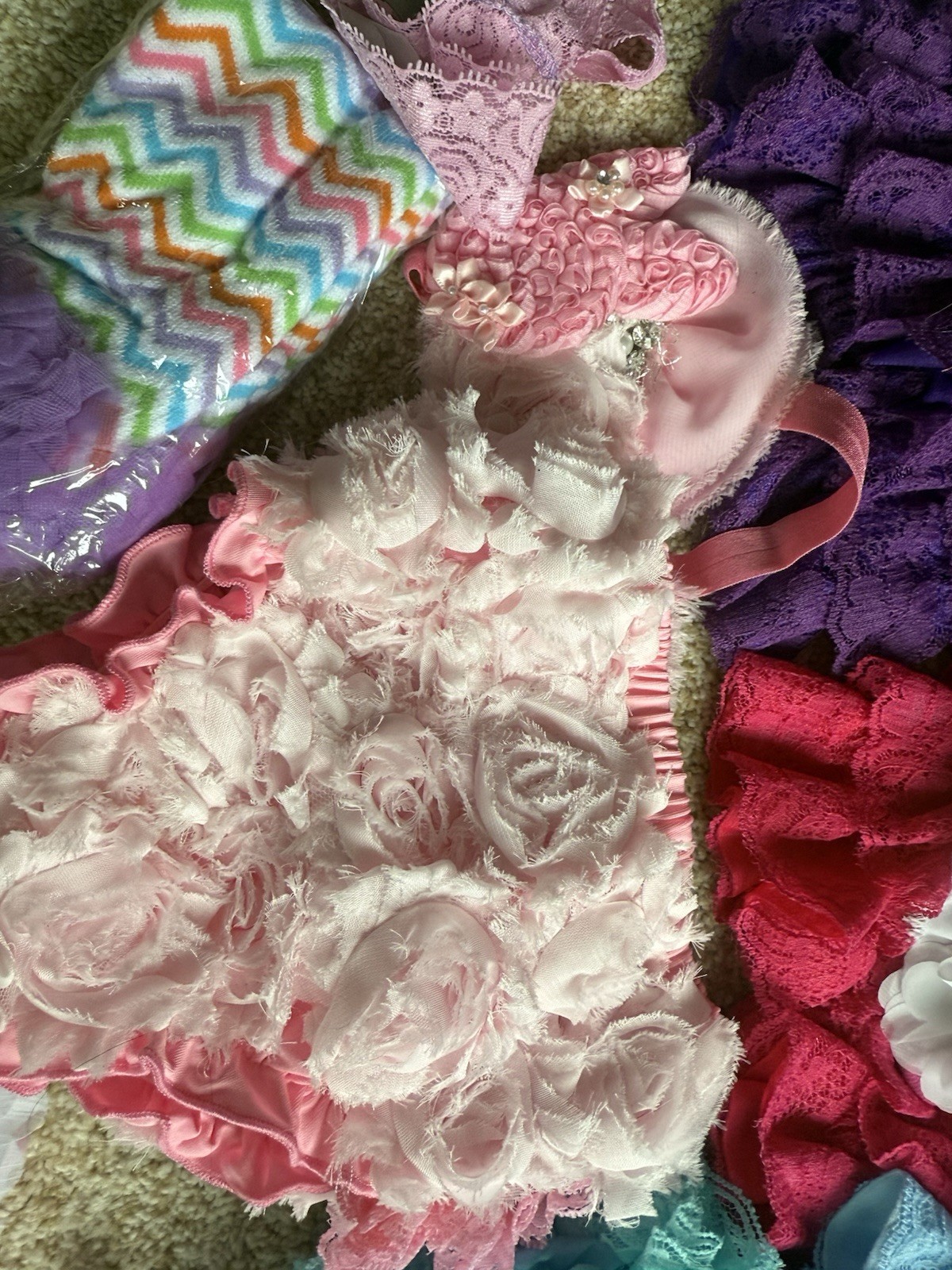 как выглядит 31 Pc CHIC BABY BOUTIQUE LOT LACE PETTIROMPERS, BLOOMERS, Smash Cake Set фото