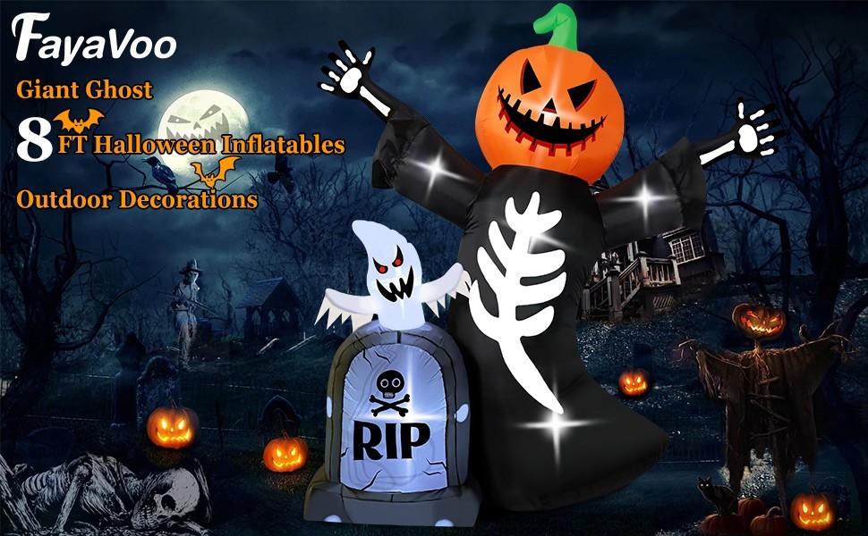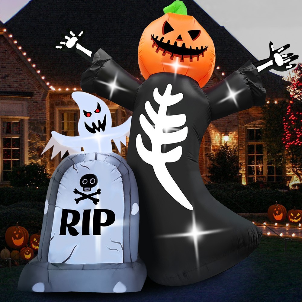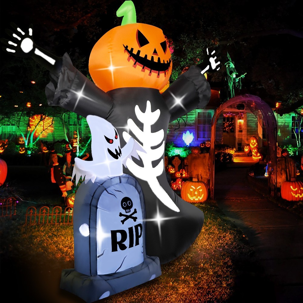 • 8 FT Tall Halloween Inflatables Blow up Pumpkin Head Ghost With Tombstone