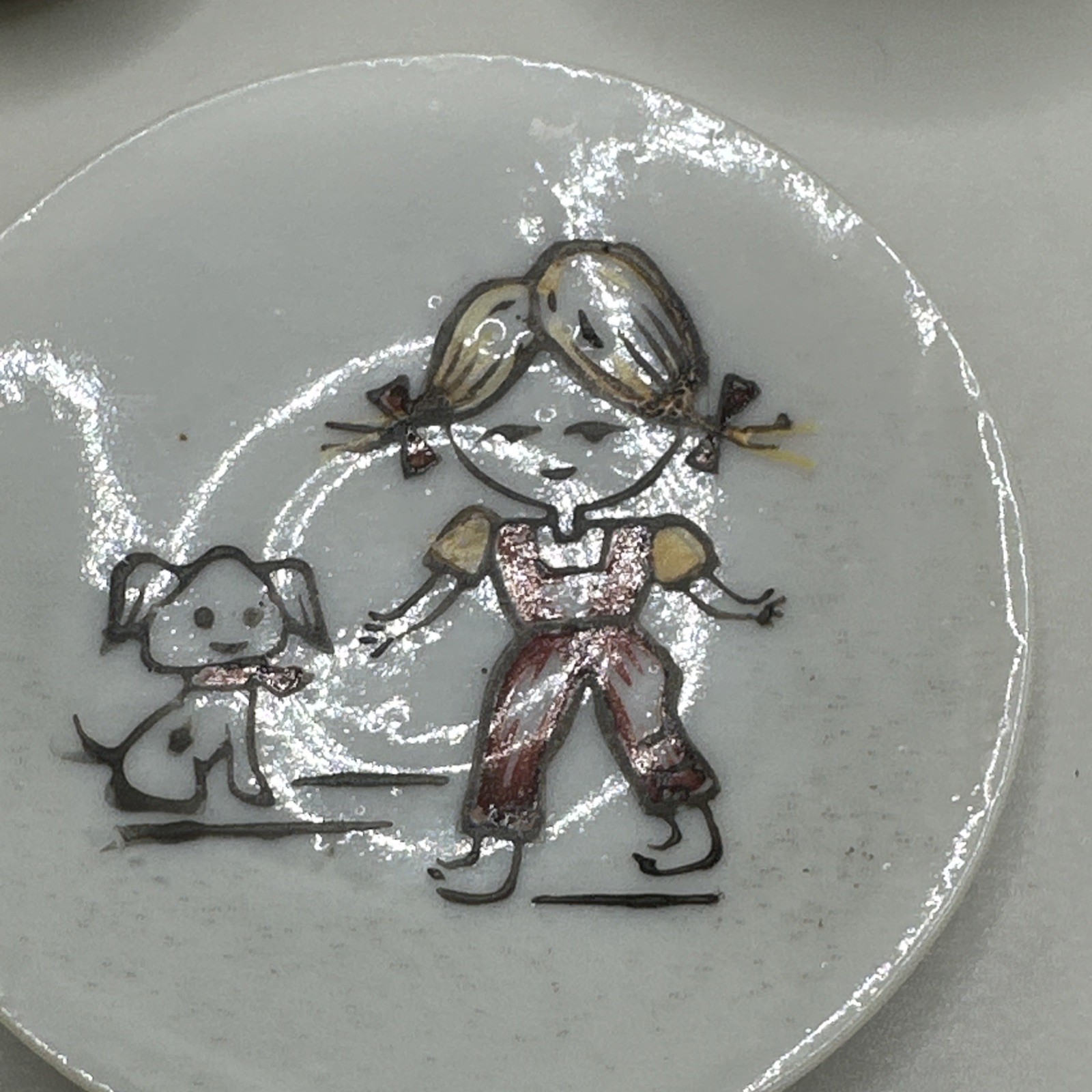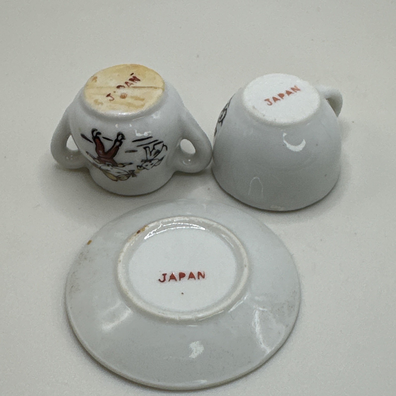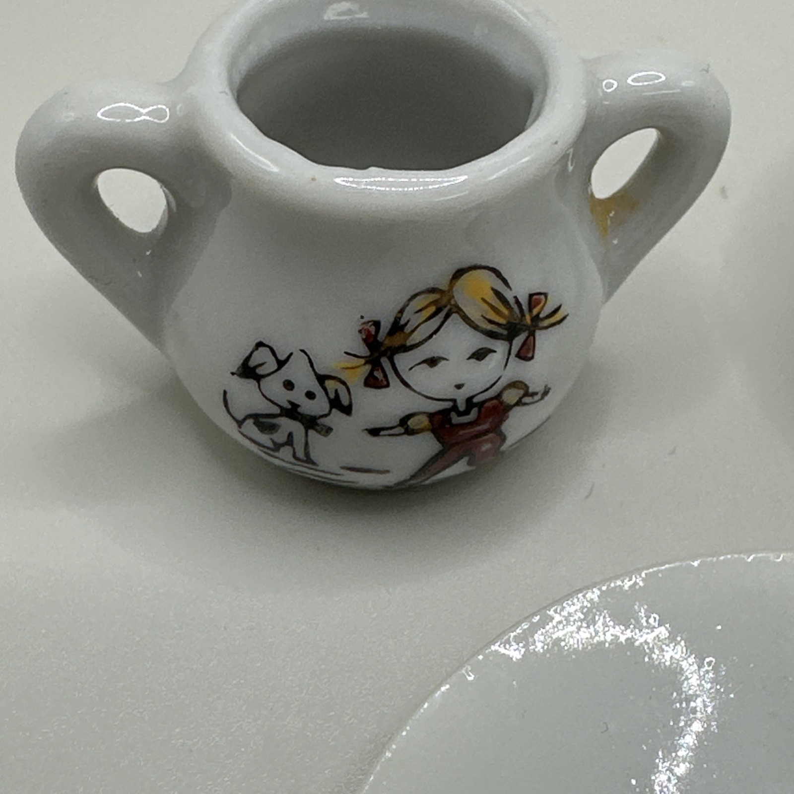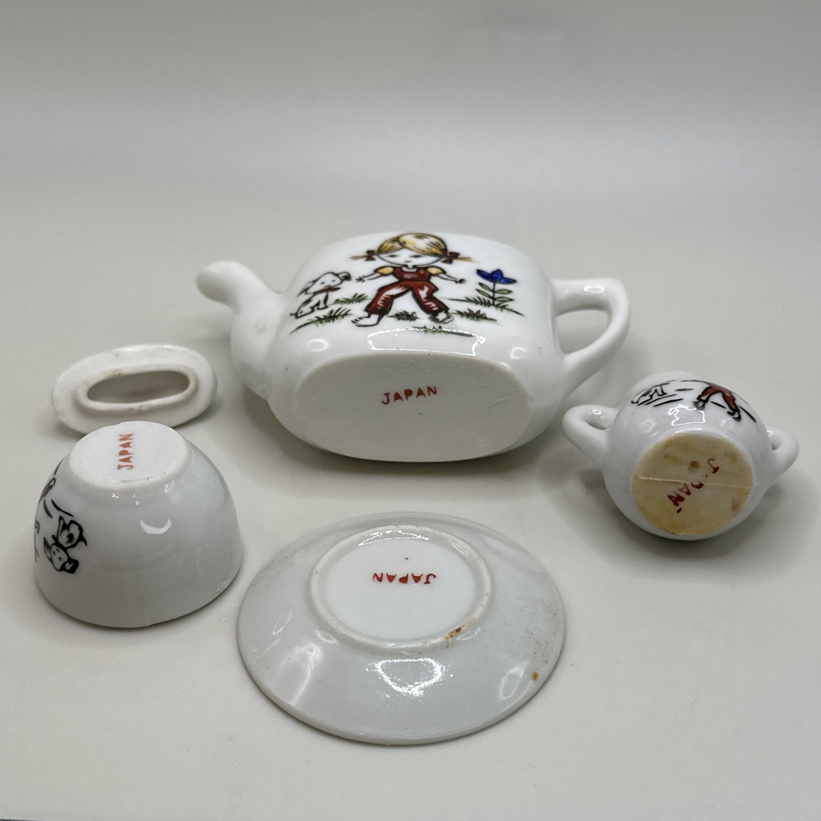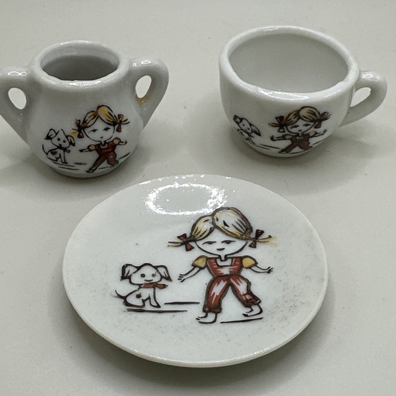 Vintage Porcelain Childrens Toy Tea Set 5 Pieces Boy Girl With Dog Japan Cups