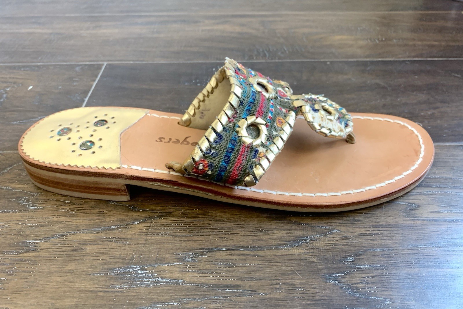 как выглядит JACK ROGERS Navajo Hamptons Thong Sandals Whipstitch Paisley Gold 7.5 or 7 RARE фото
