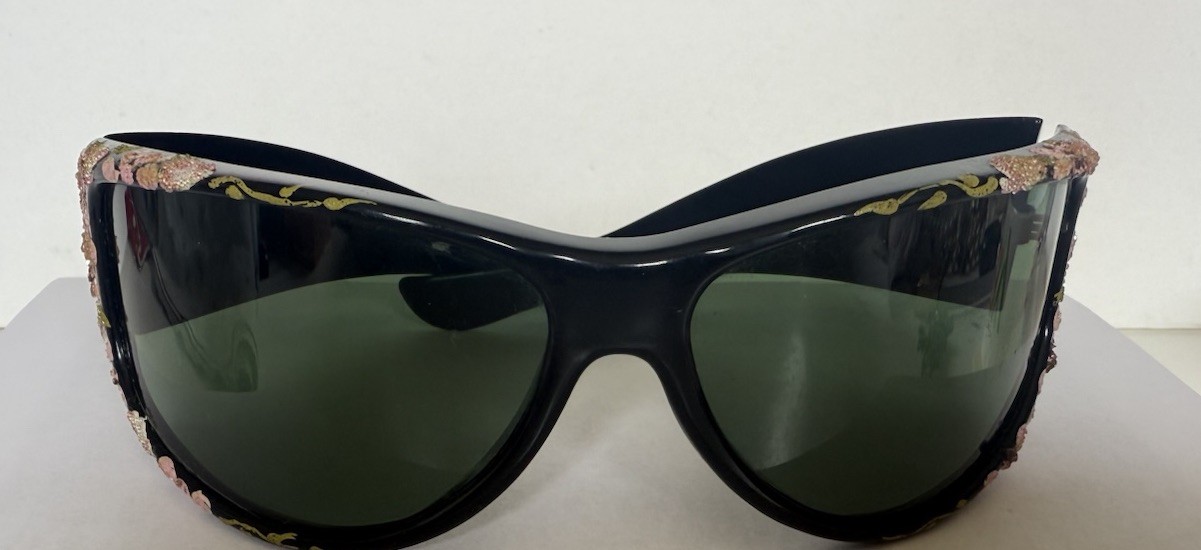 Vtg Foster Grant Large Black Frames ,Flower Embellished Sunglasses Made in USA
