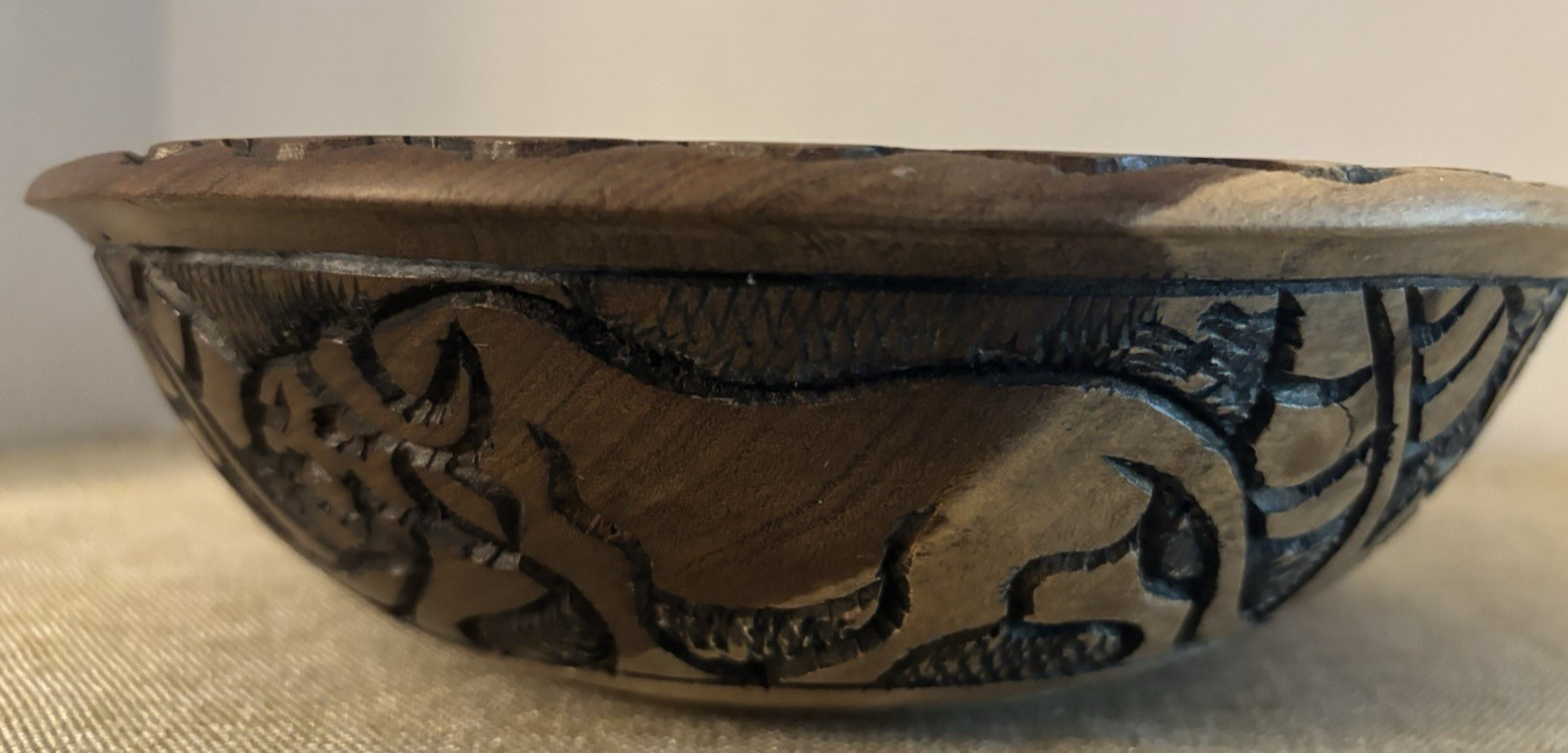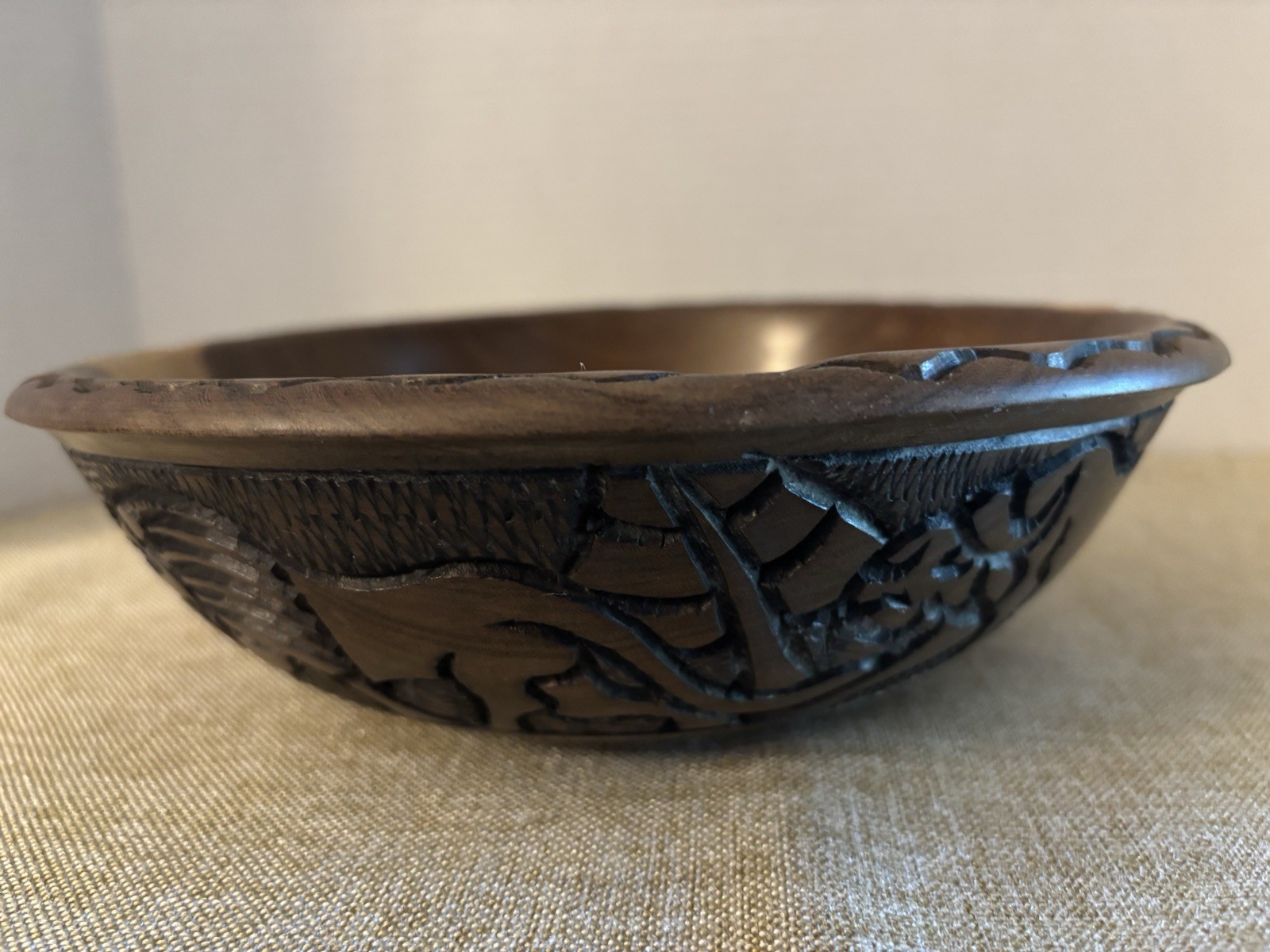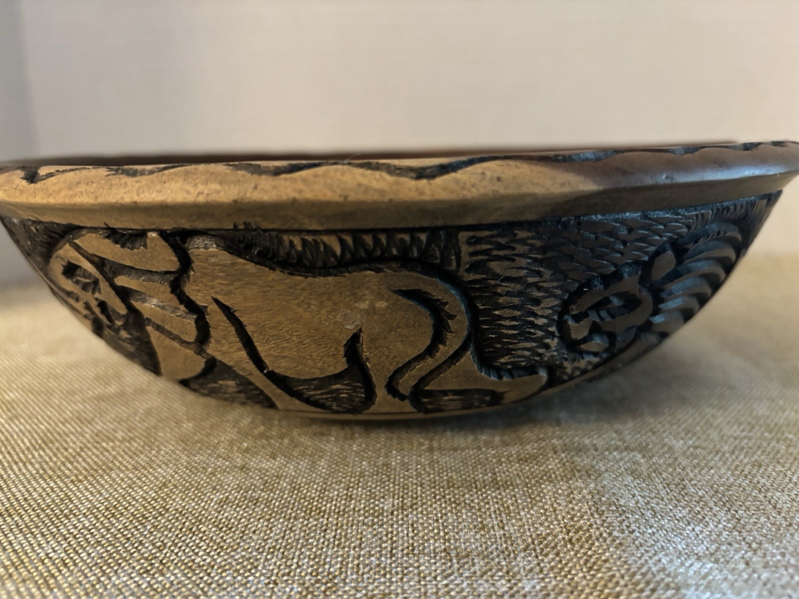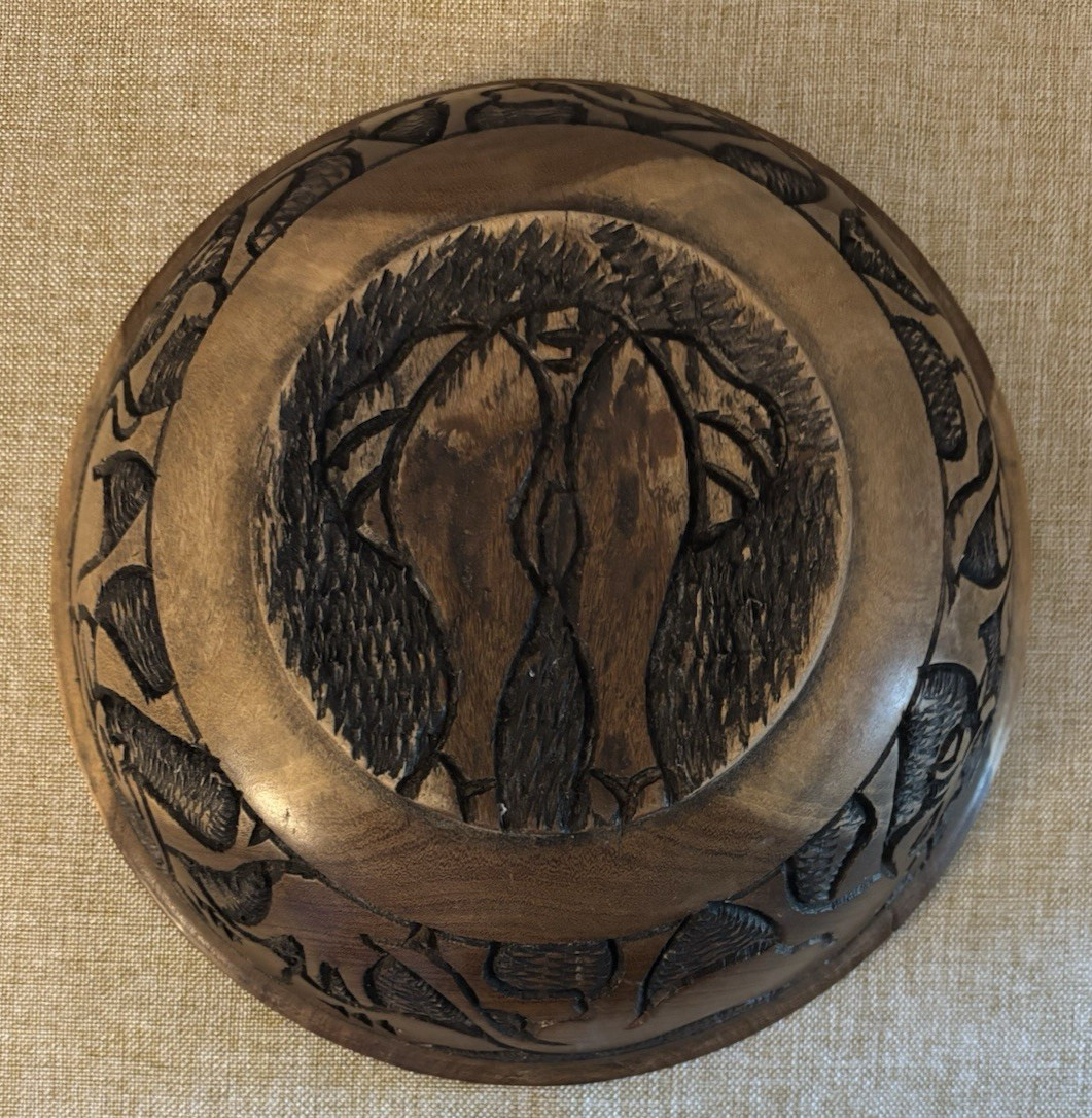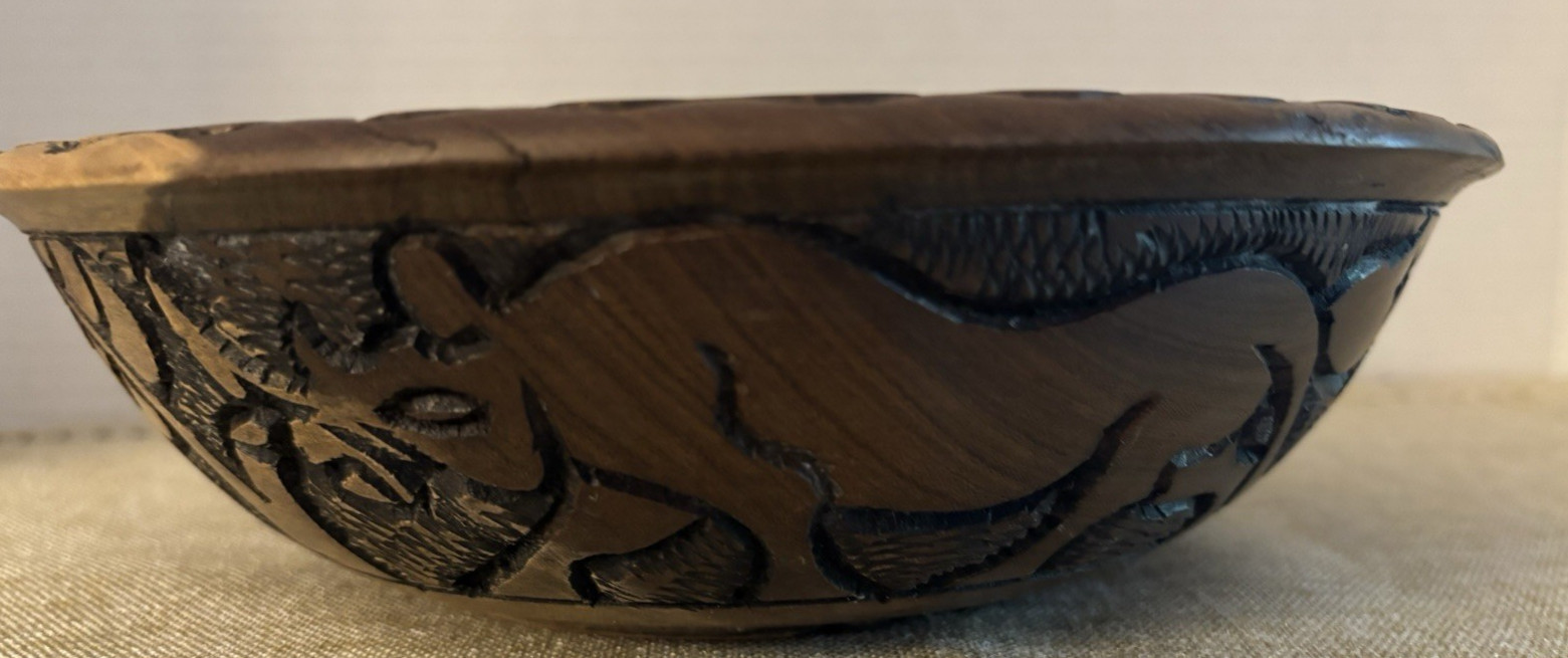 Decorative Intricately Hand Carved Wood Bowl Elephant Other Animals Dk Lt Wood