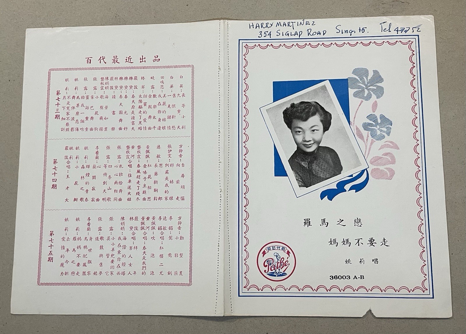 1950's Chinese 78rpm record lyrics sheet PATHE 36003 Yao Li
