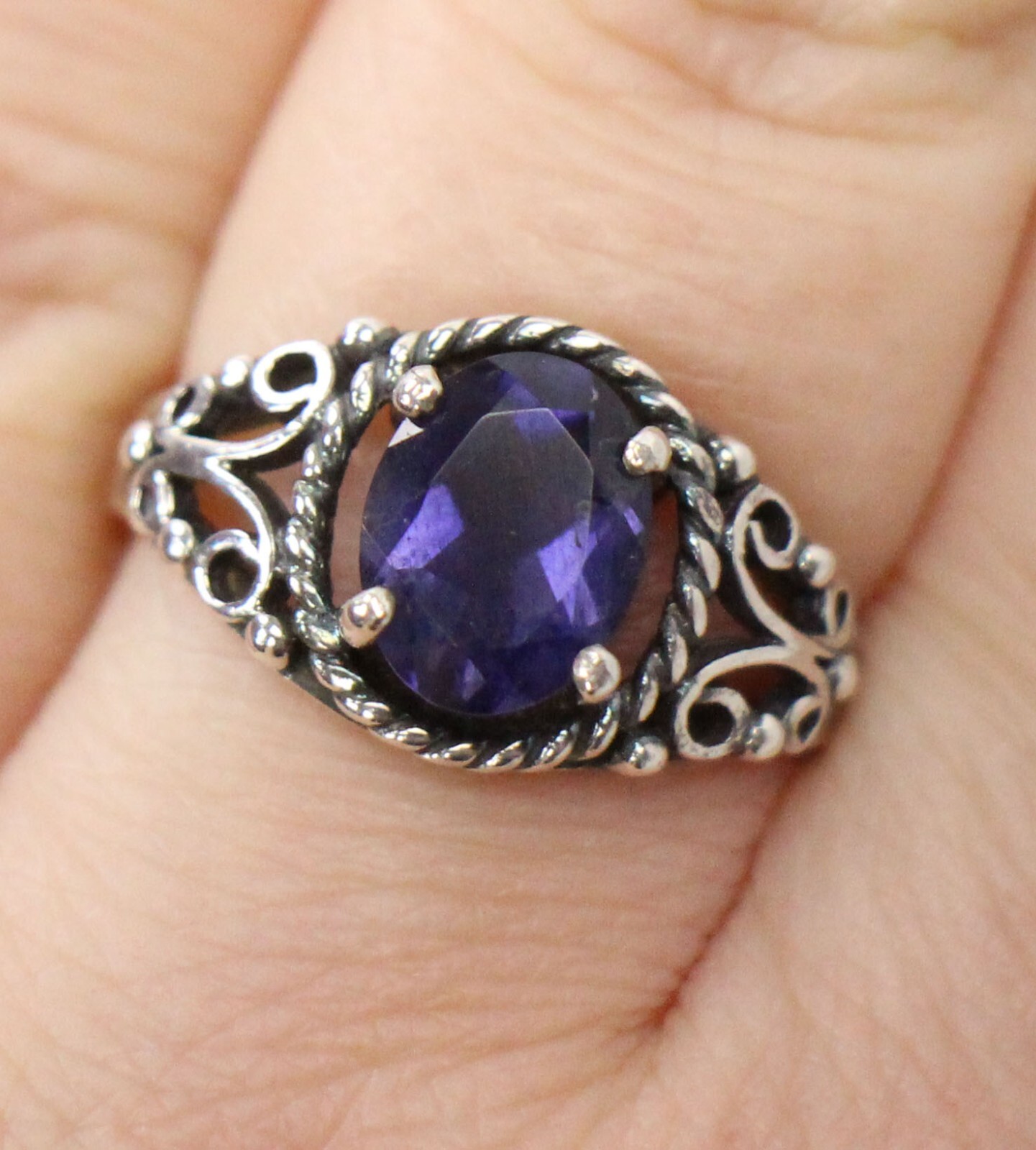 Vintage .925 Sterling Silver Amethyst Ring 5 3/4 Filigree Oval Purple Ladies