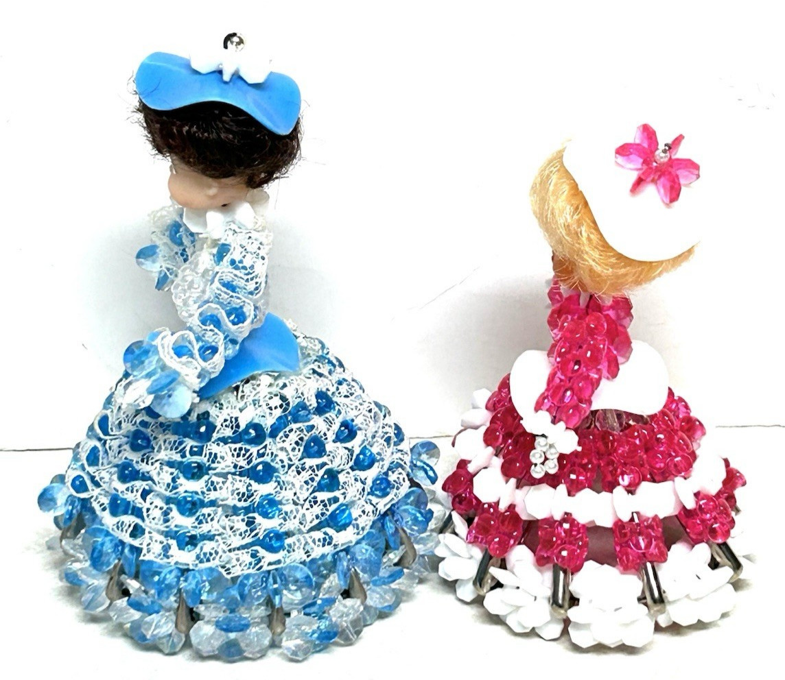 2 VINTAGE HANDMADE SAFETY PINS DOLLS PINK BLUE WHITE BEADED LACE RUBBER HEAD