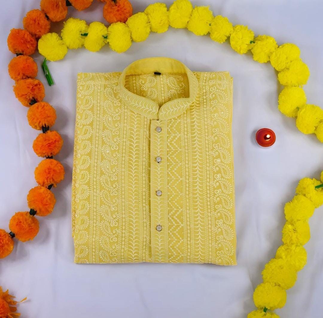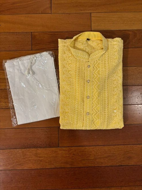 Men s Yellow Cotton Kurta with White Pajama Traditional Indian Ethnic Wear