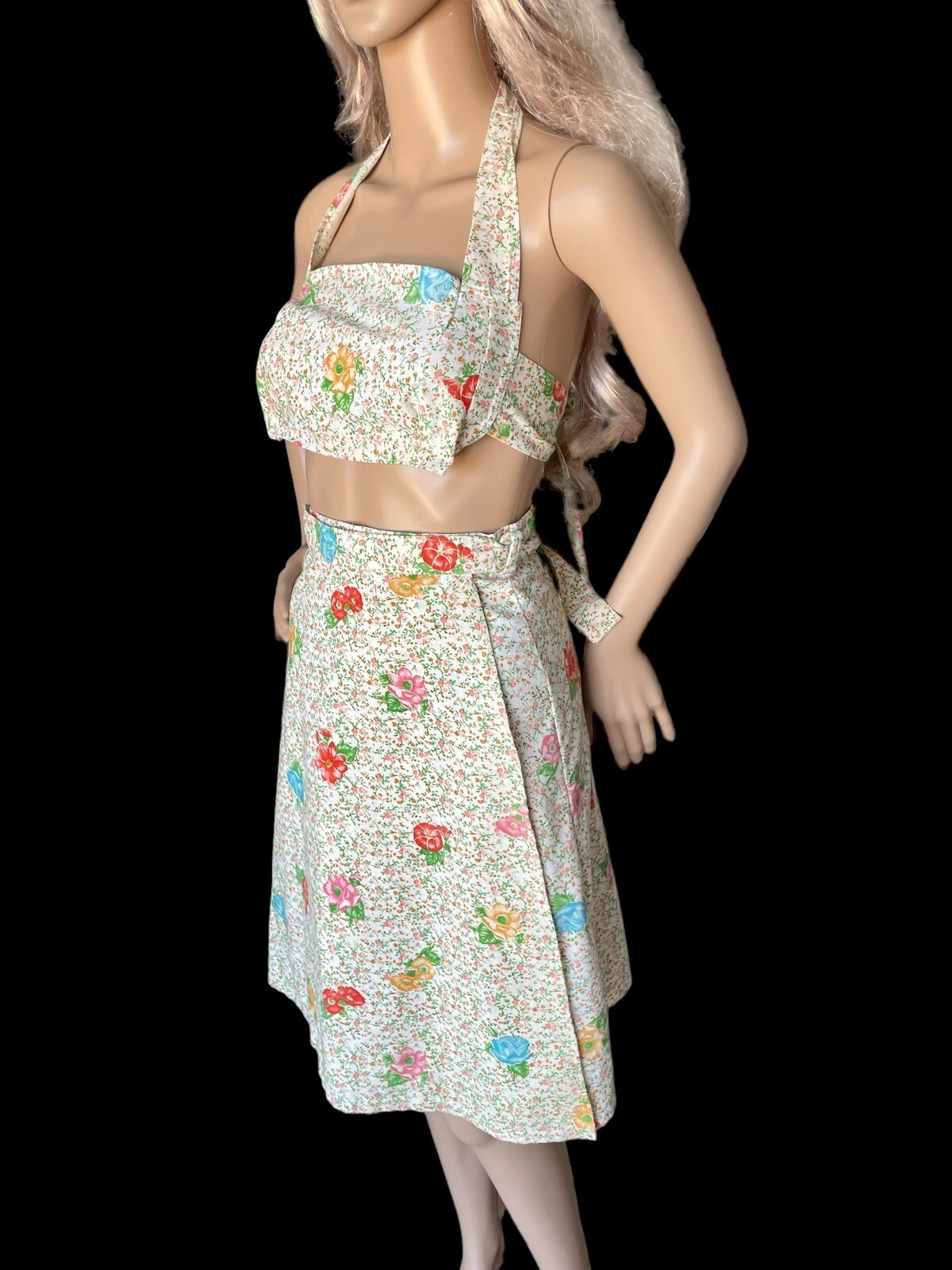 Vintage 70s Handmade Set Floral Crop Halter Top Full Wrap Skirt XS-S