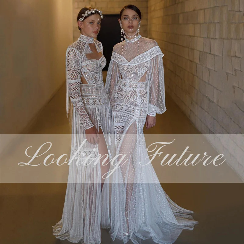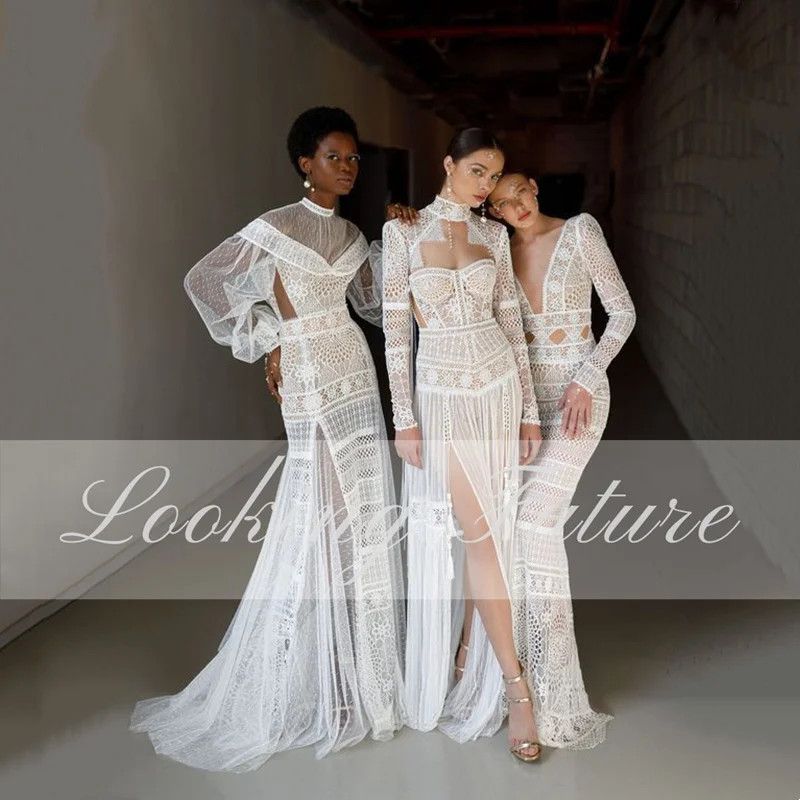Backless Wedding Dress A-Line Long Sleeves Floor Length Robe De Mariee High Side