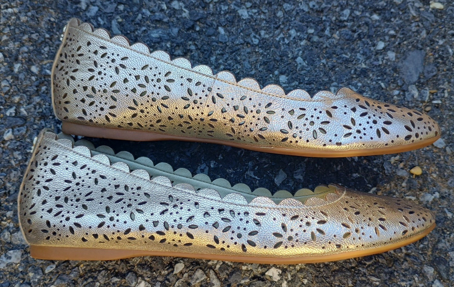 как выглядит Metallic Gold COACH Carsin Cutout Floral Pattern Ballet Flats 6 Scalloped Trim фото