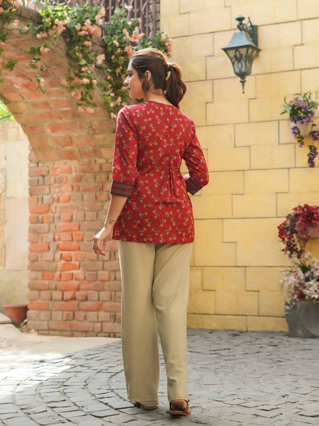 как выглядит Women Maroon Ethnic Motifs Floral Printed Short Cotton Kurti фото
