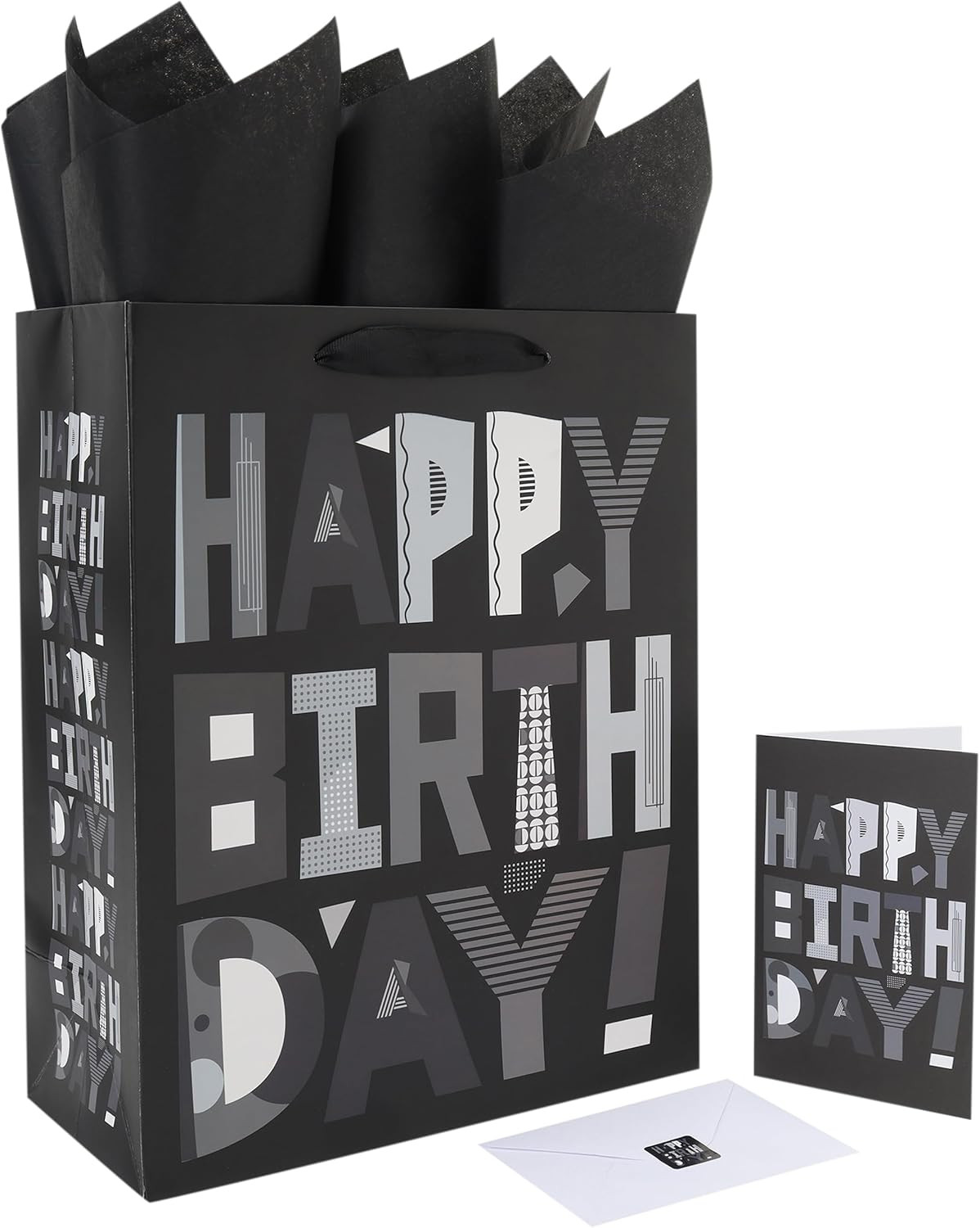 13 Large Black Happy Birthday Gift Bag Set with Handles, Greeting Card, Tissue