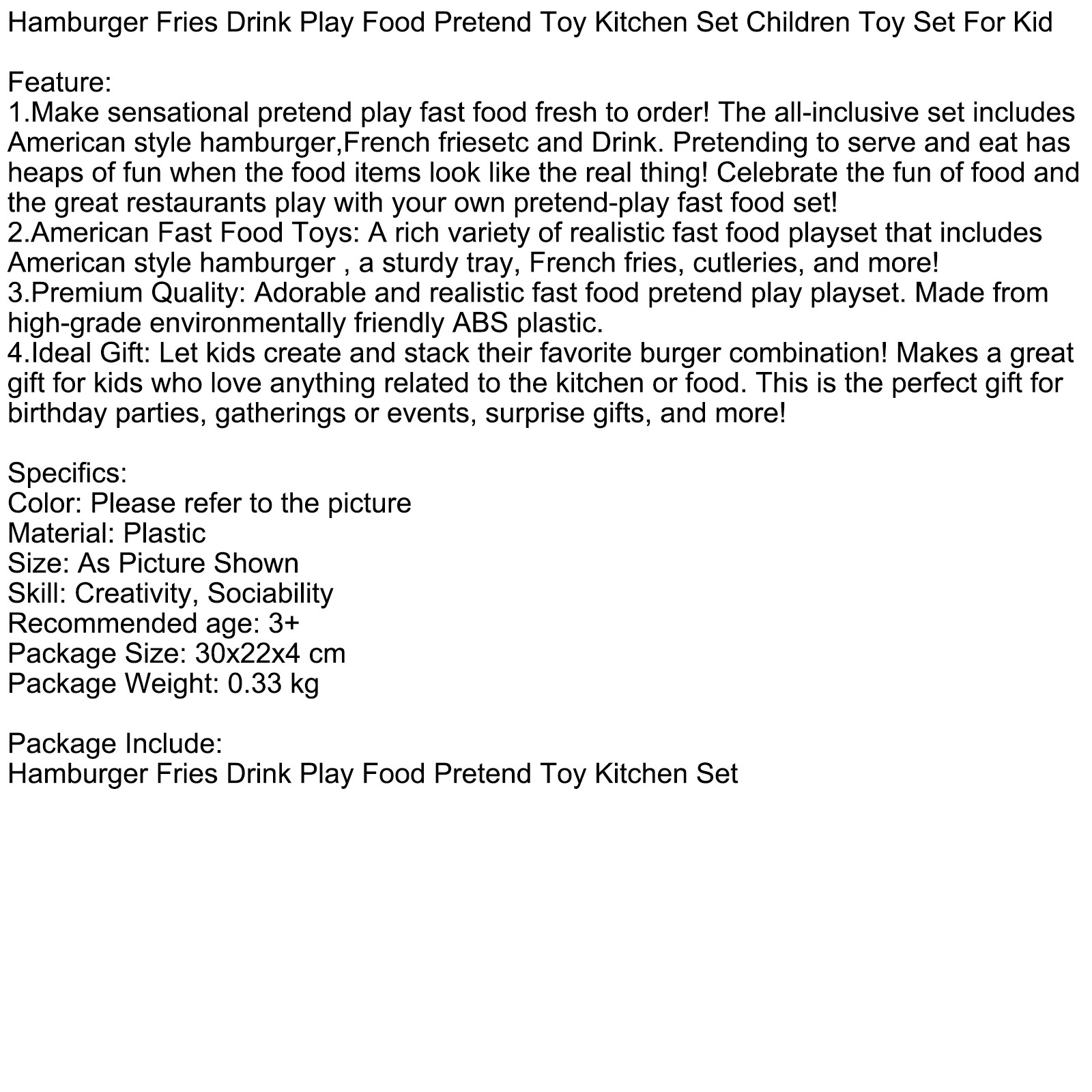 Тип: Hamburger Fries Drink Play Food Pretend Toy Kitchen Set