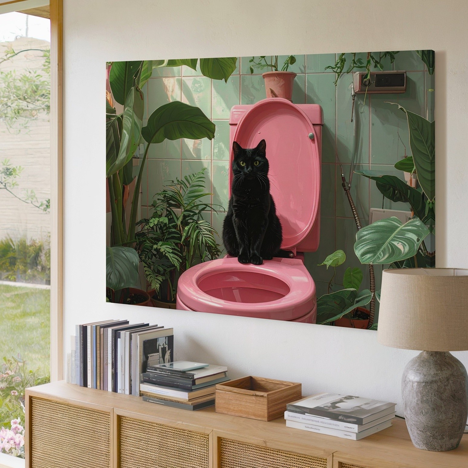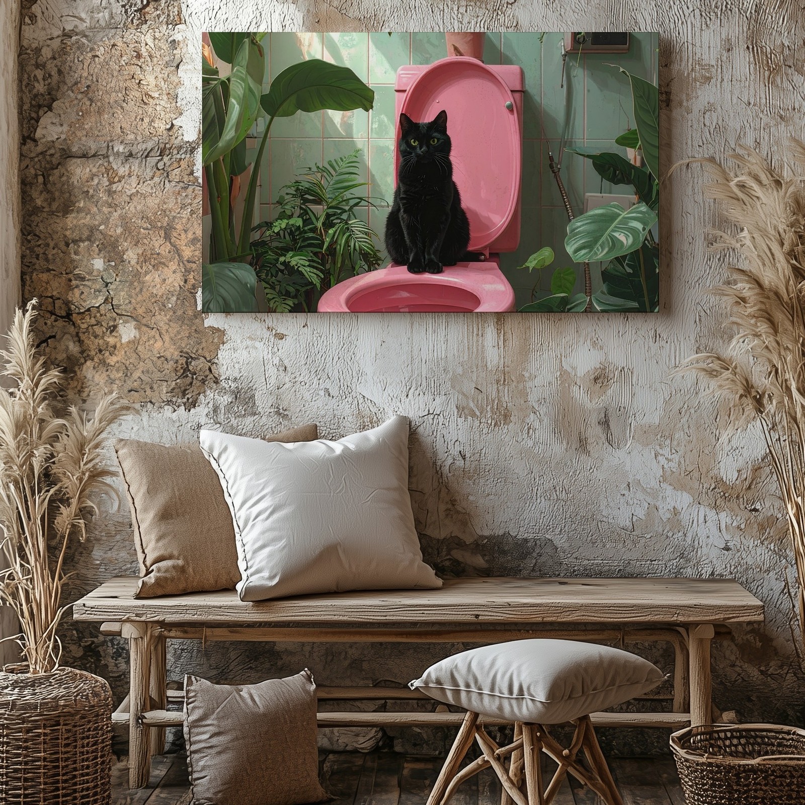 Wall Art Canvas a Black Cat Sitting on a Bright Pink Toilet Surrounded by