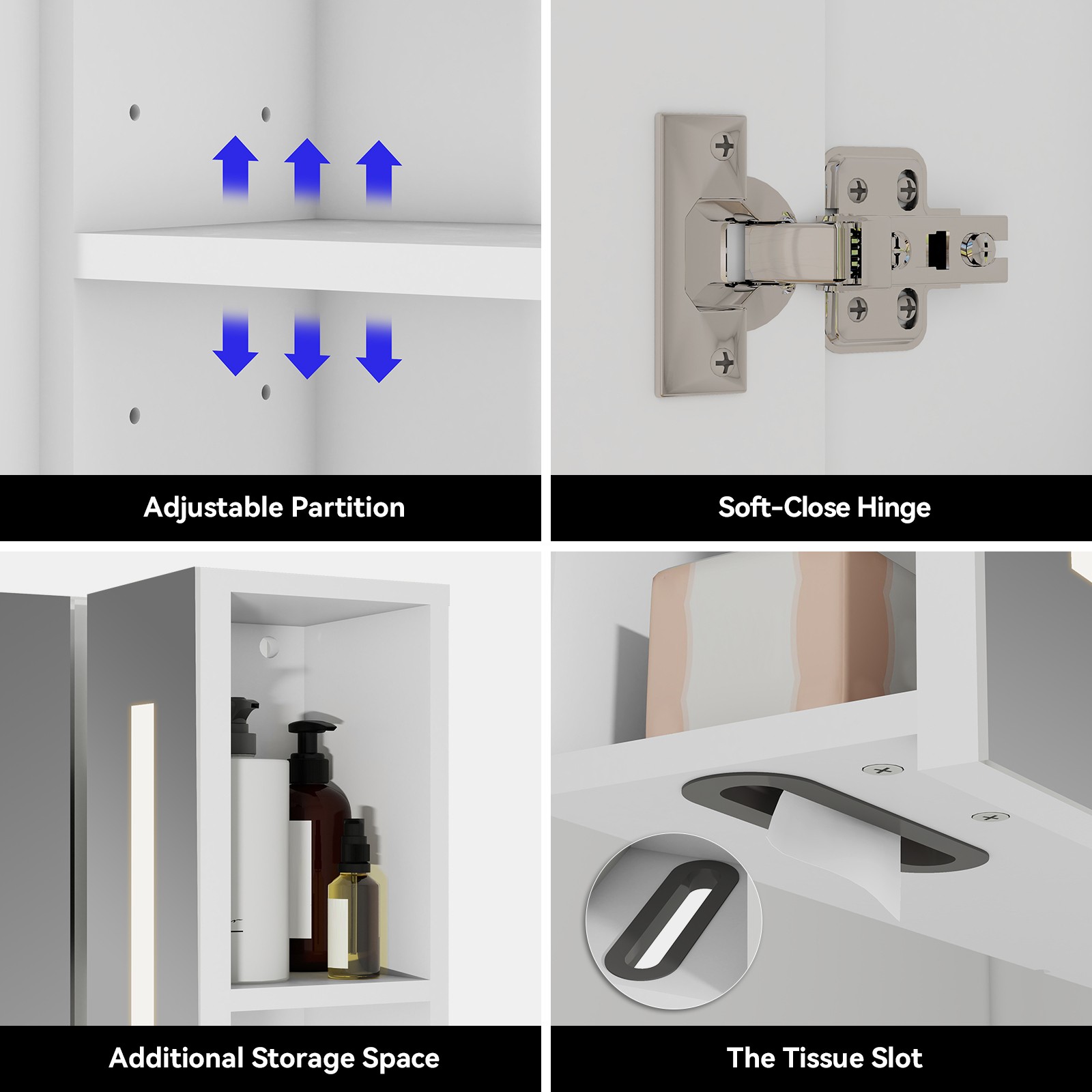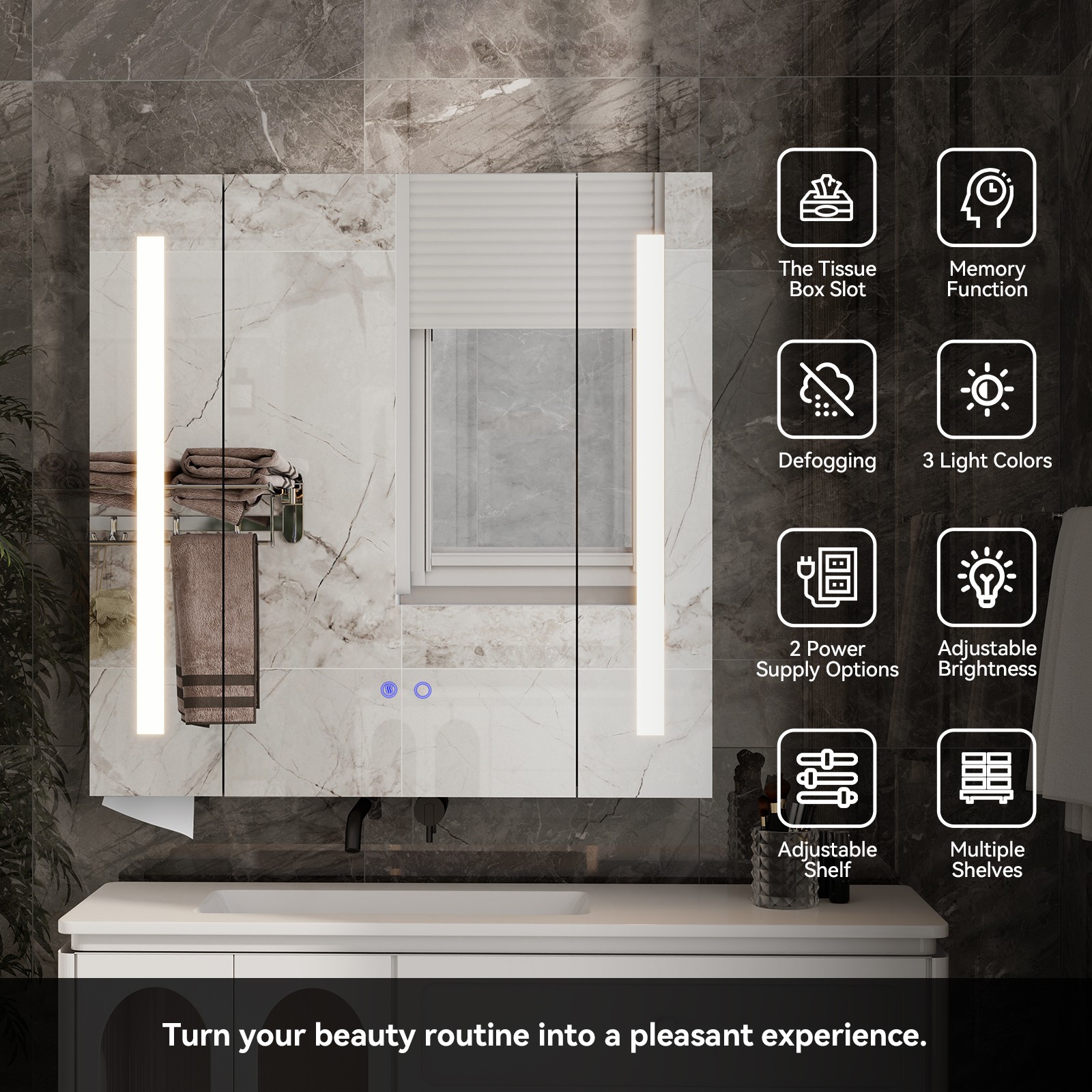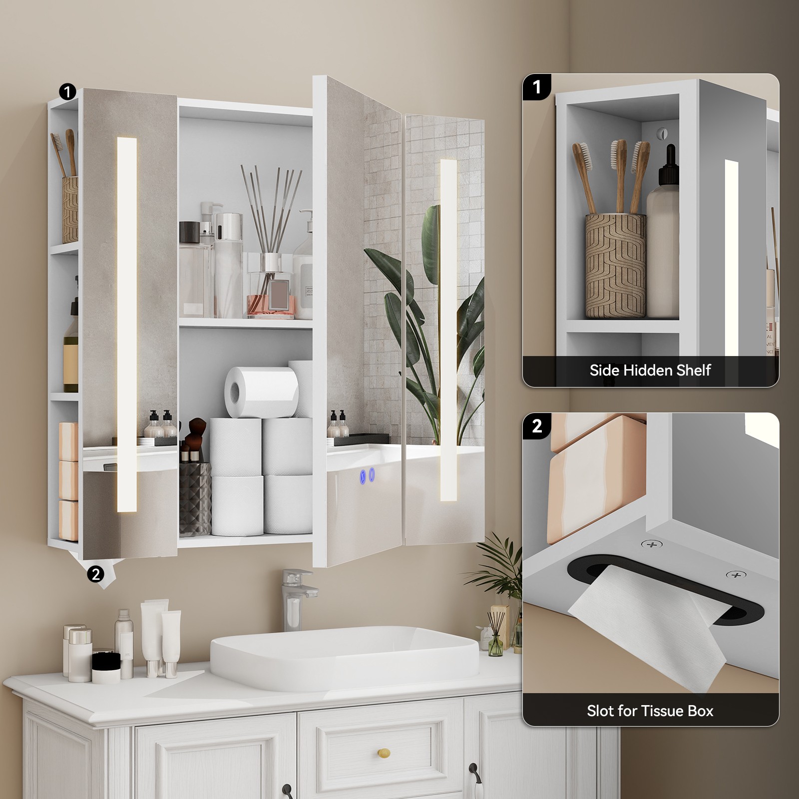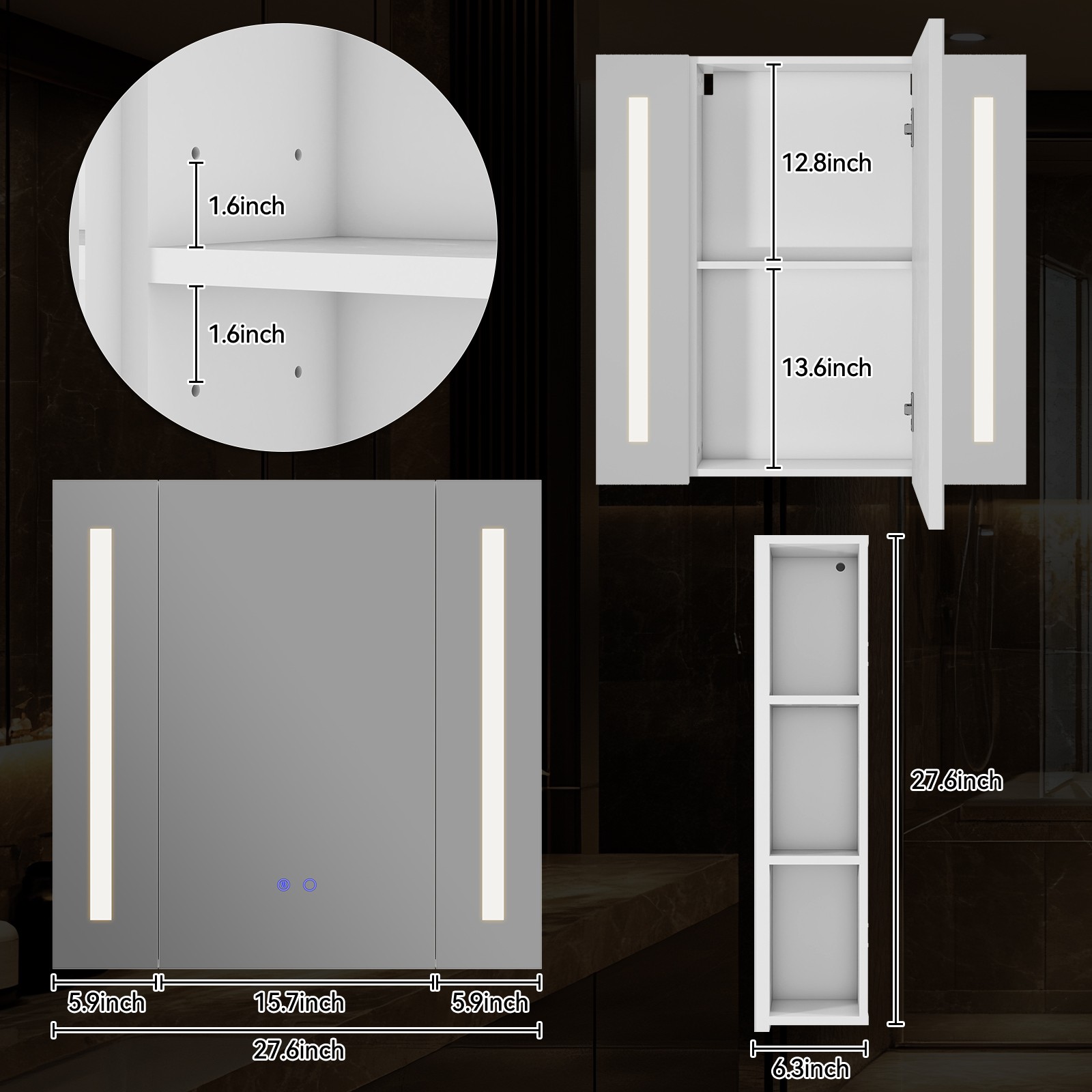 Dimmable LED Lighted Cabinet Bathroom Mirror, Anti-Fog Defogger,Adjustable Shelf
