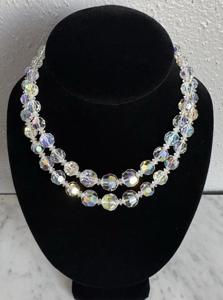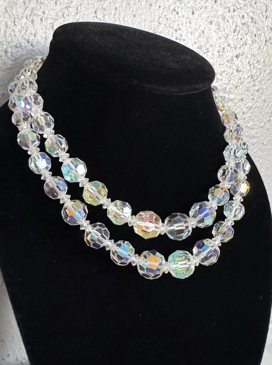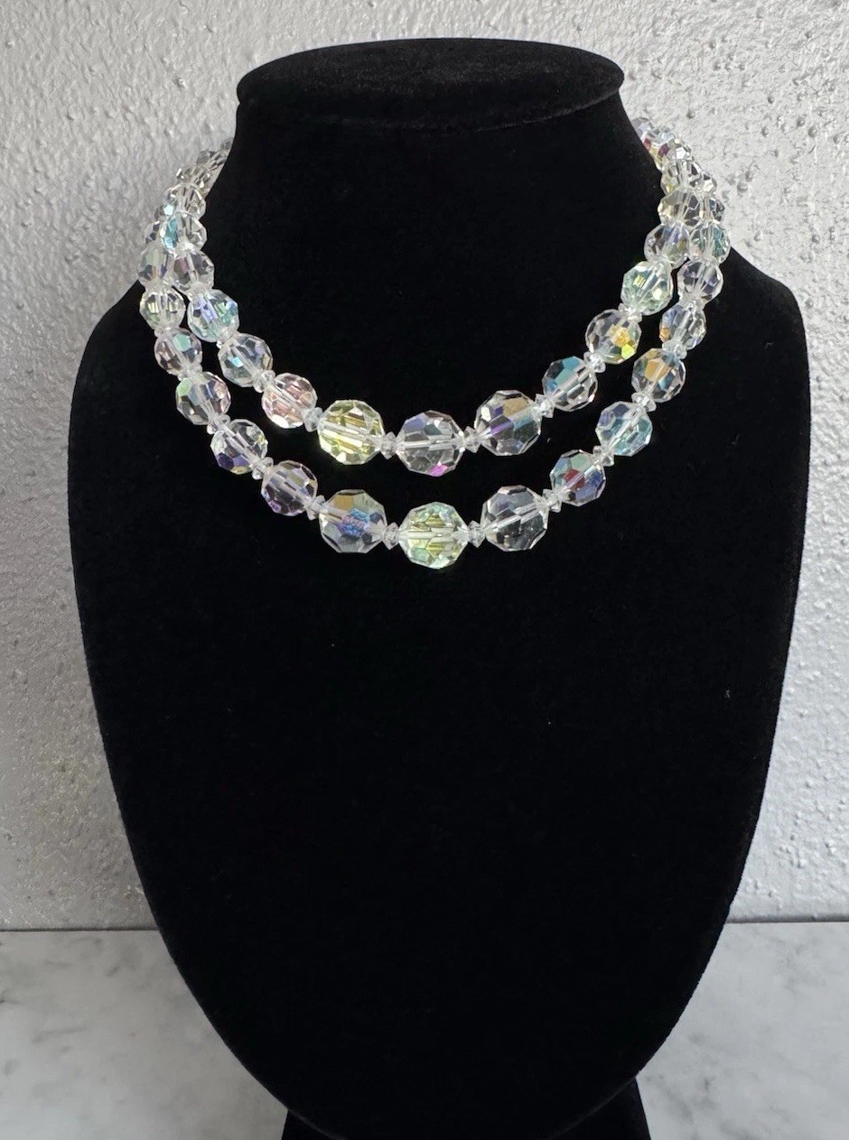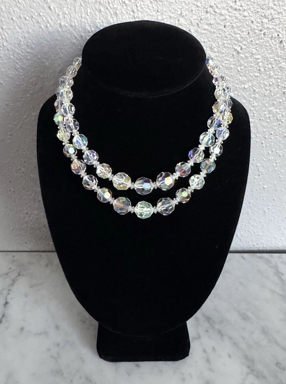 Vintage Aurora Borealis Double Strand Graduated Crystal Bead Choker Necklace 13