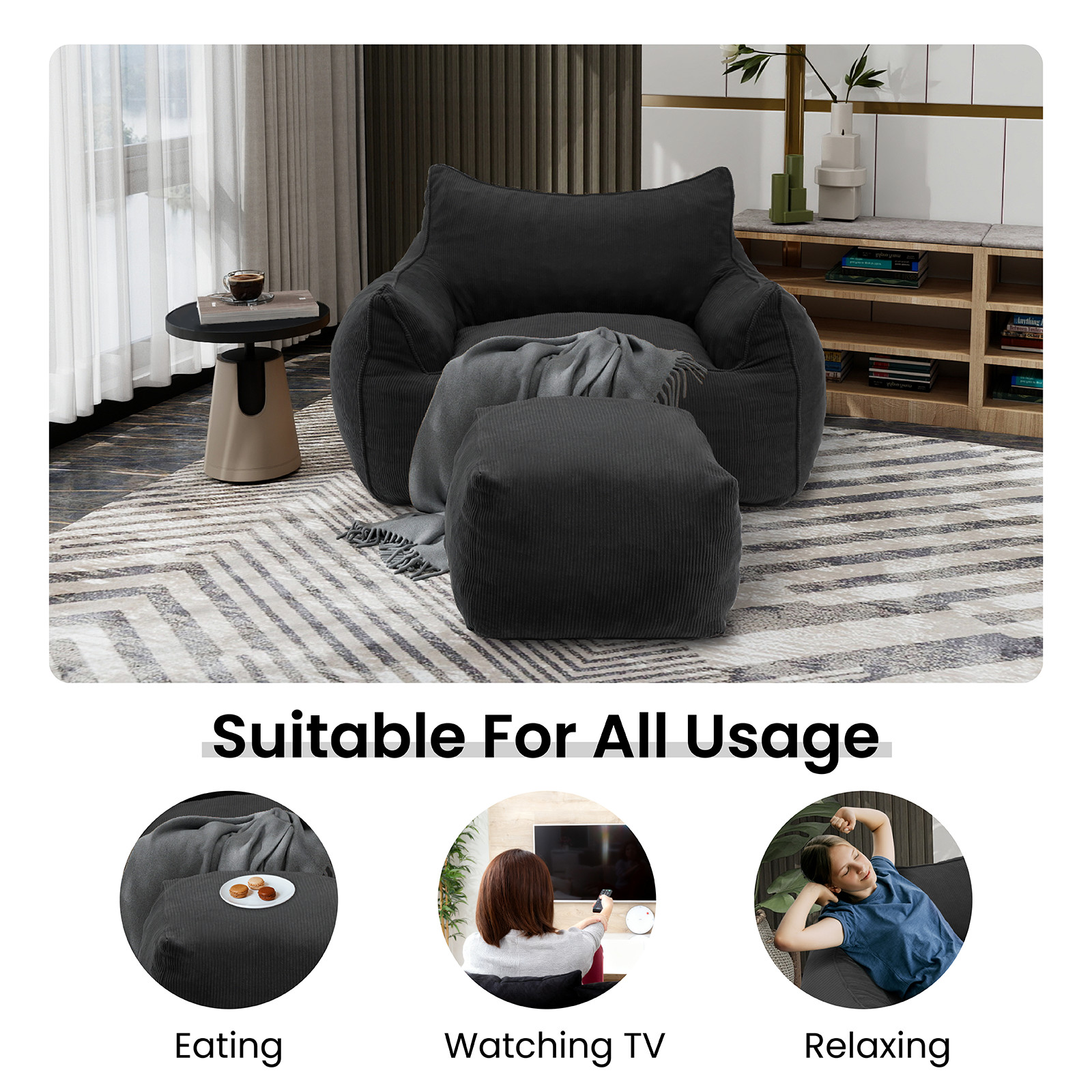 Corduroy Bean Bag Chair with High-Resilience Foam, Padded Back Wide Armrests