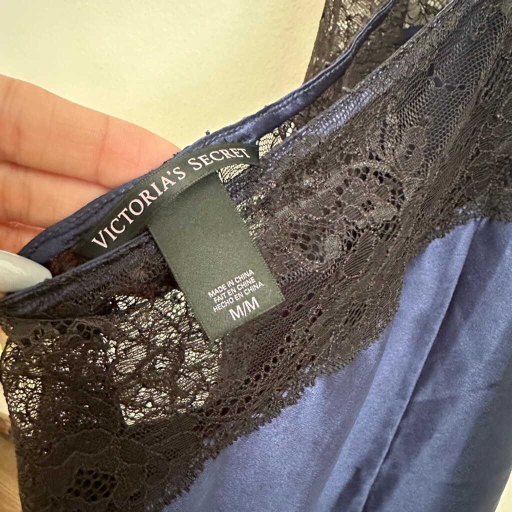 как выглядит Victoria s Secret Satin Lace Slip Dress Navy Black Lingerie Babydoll Medium фото