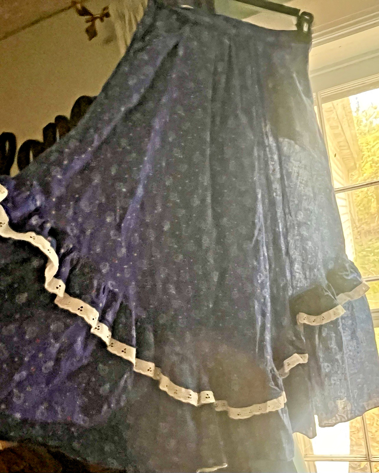 VTG 70 s Ms. Paquette Skirt Prairie Blue Calico Ruffles Eyelet POCKETS SZ 12