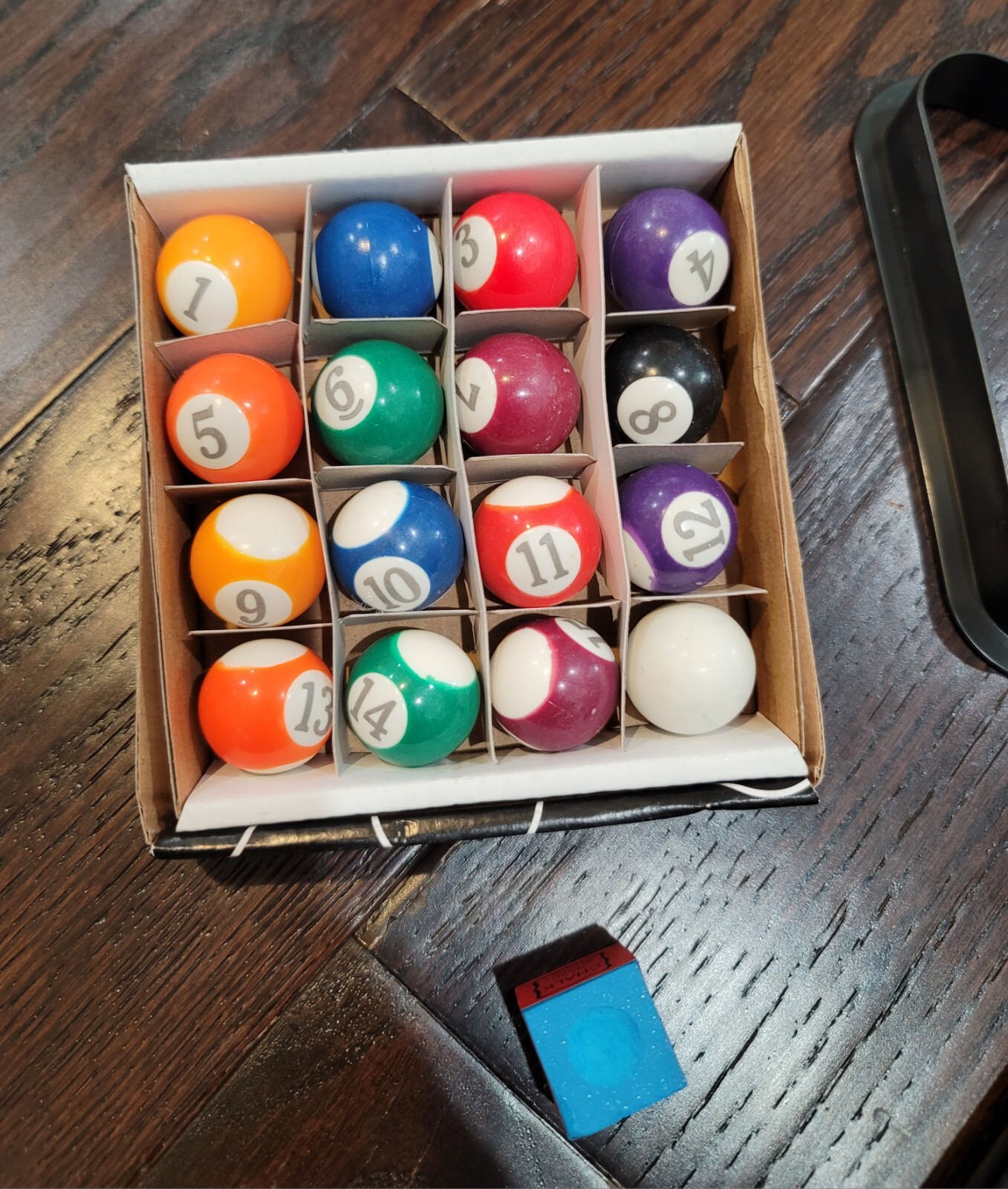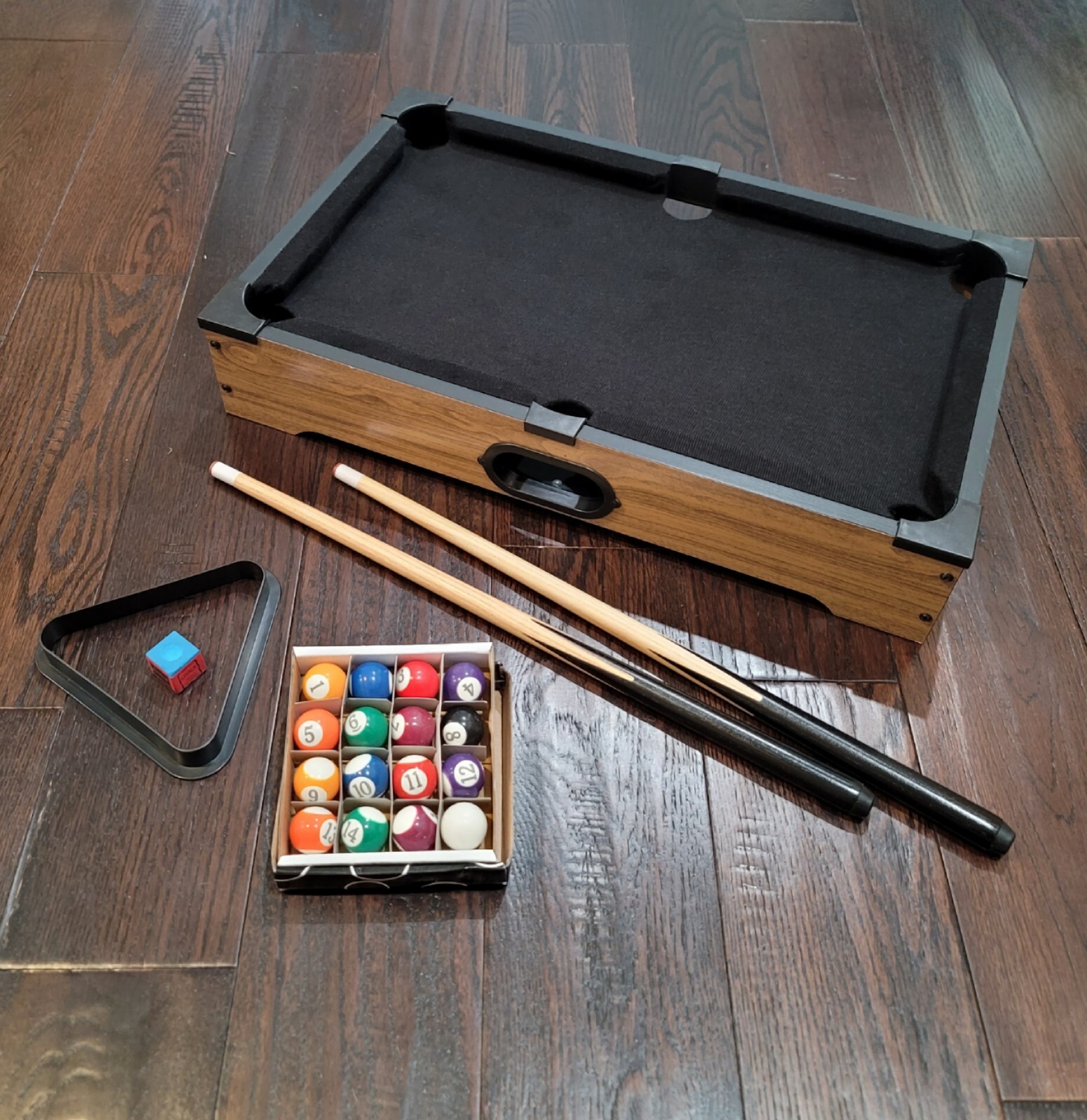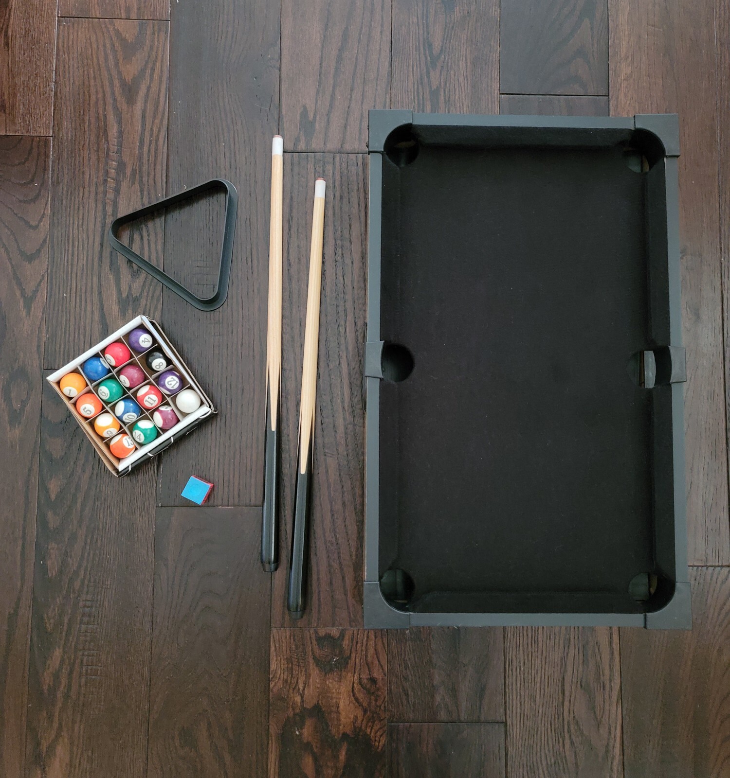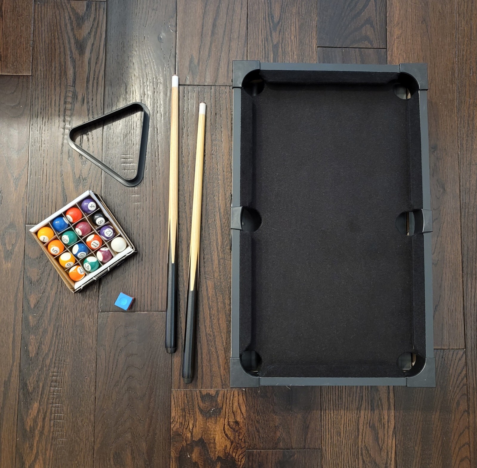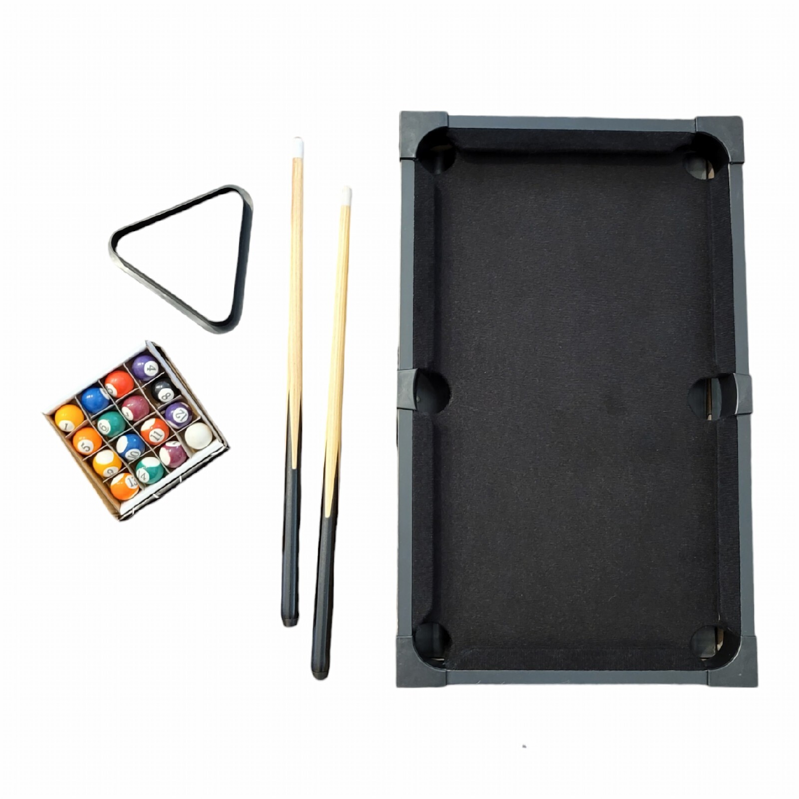 Items Included: Tabletop Pool Table, 2 Cue Sticks, 1 Chalk, Triangle, Pool Balls