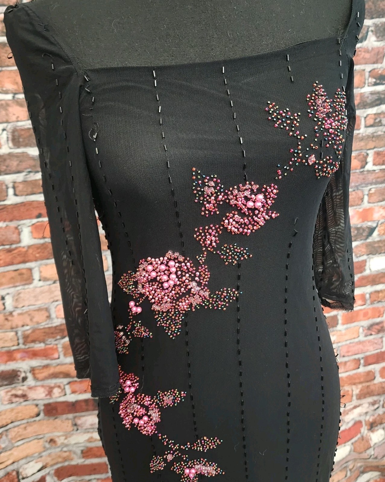 Beaded Black Midi Dress Small Witchy Sheer Lace Fairy Grunge Whimsigoth FLAWED