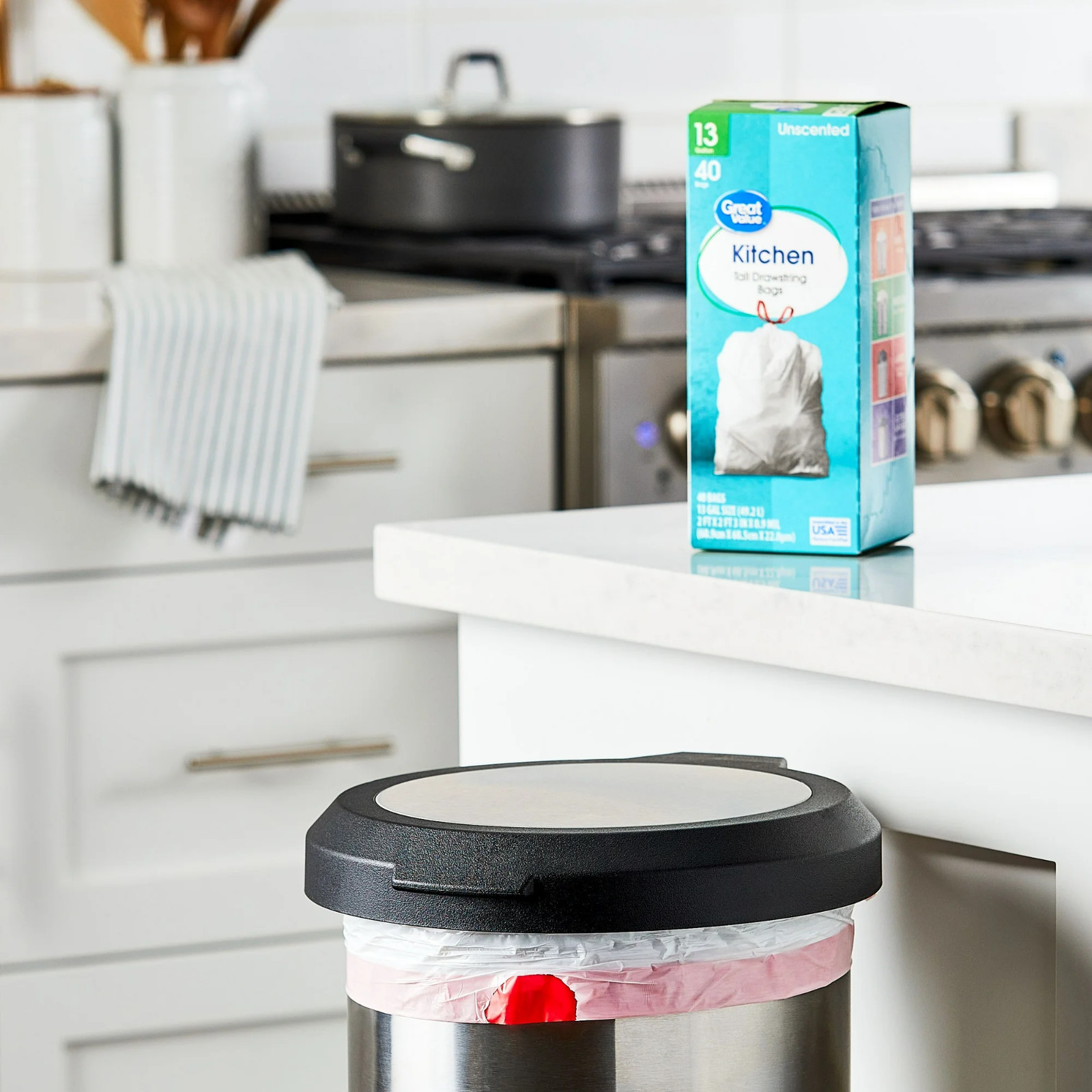 Great Value 13-Gallon Drawstring Tall Kitchen Trash Bags, Unscented, 40 Bags