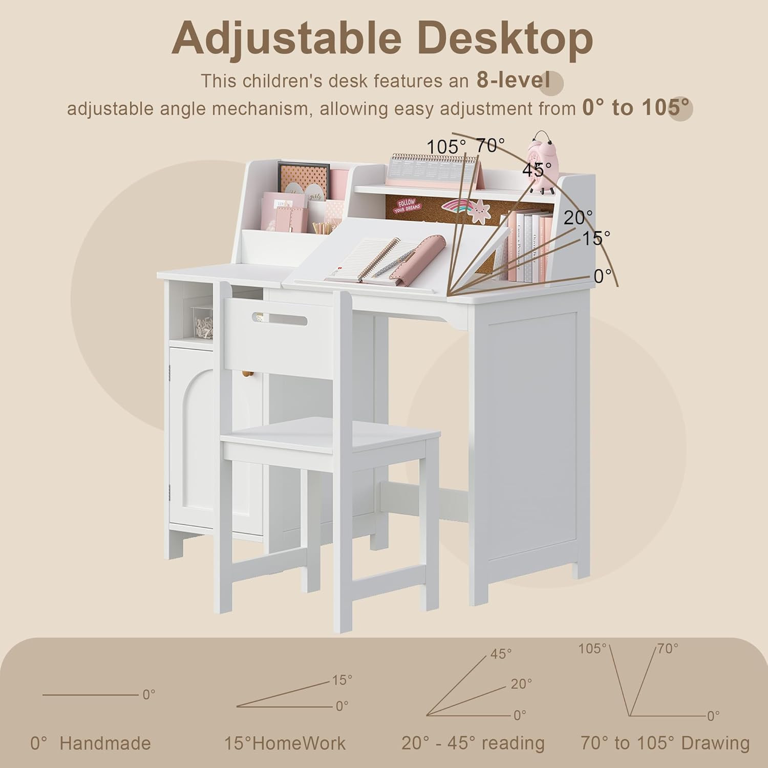 как выглядит Kids Study Desk and Chair Set, Kids Desk with Hutch and Tiltable Desktop for 3-8 фото