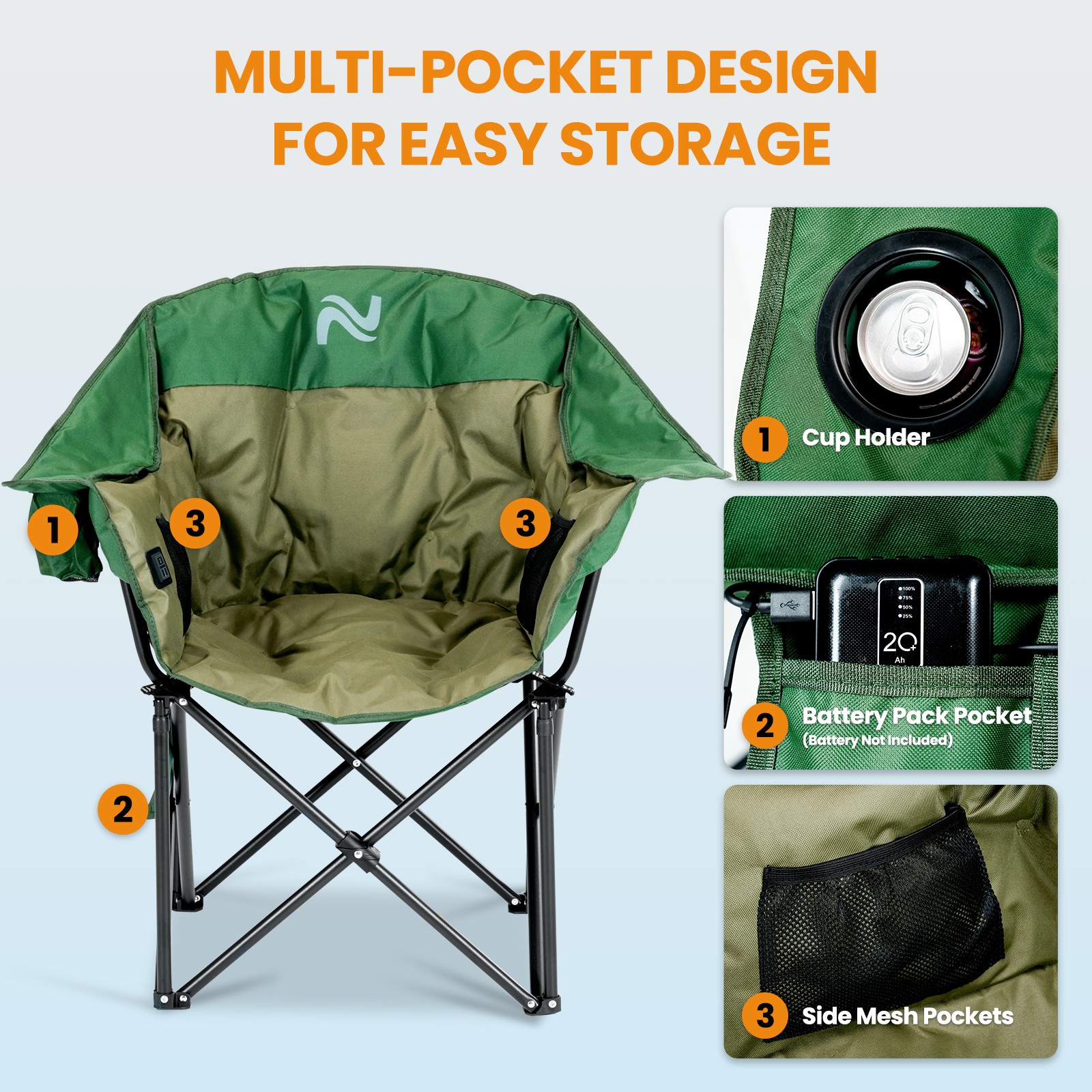 Oversized Heated Camp Chair - Thick Padded Seat with Massage Function