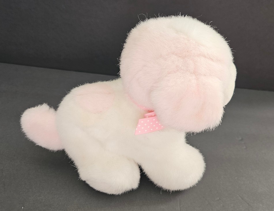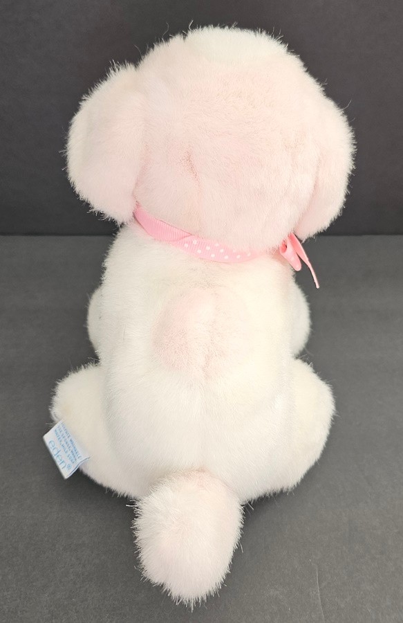 как выглядит Eden Wind Up Musical Puppy Dog Plush Toy Pink White Polka Dot Bow Vintage Rare фото