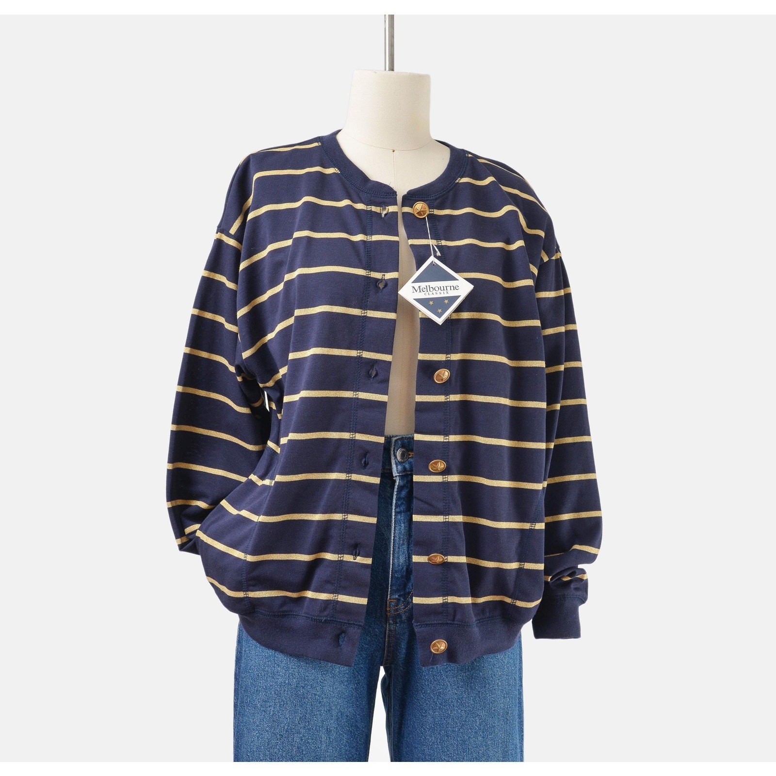 Vintage 90s Navy Gold Nautical Striped Sweater Cardigan size M
