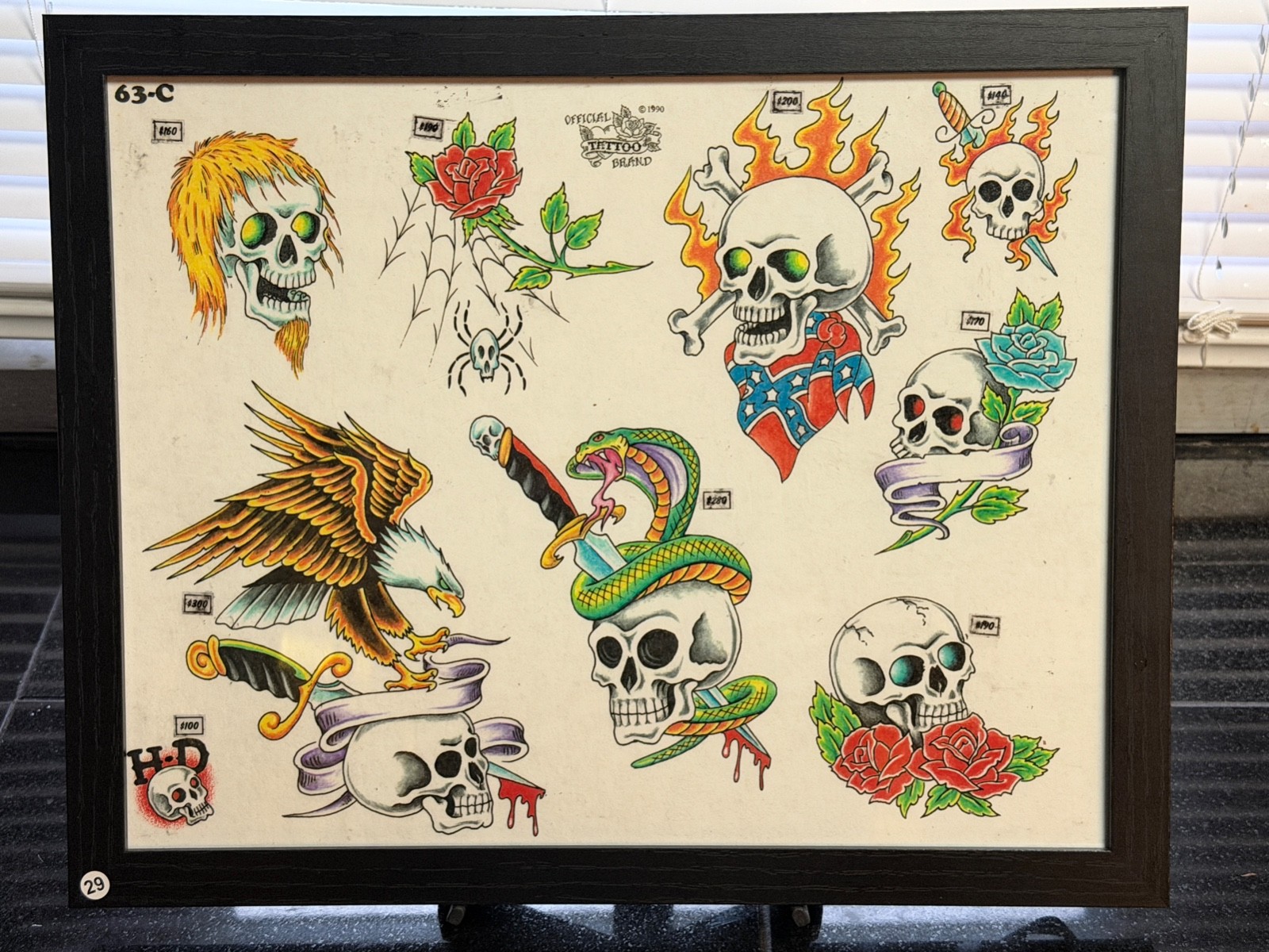 как выглядит American Traditional Tattoo Flash Art Framed 11x14 Ready-to-Hang 29 Skulls фото