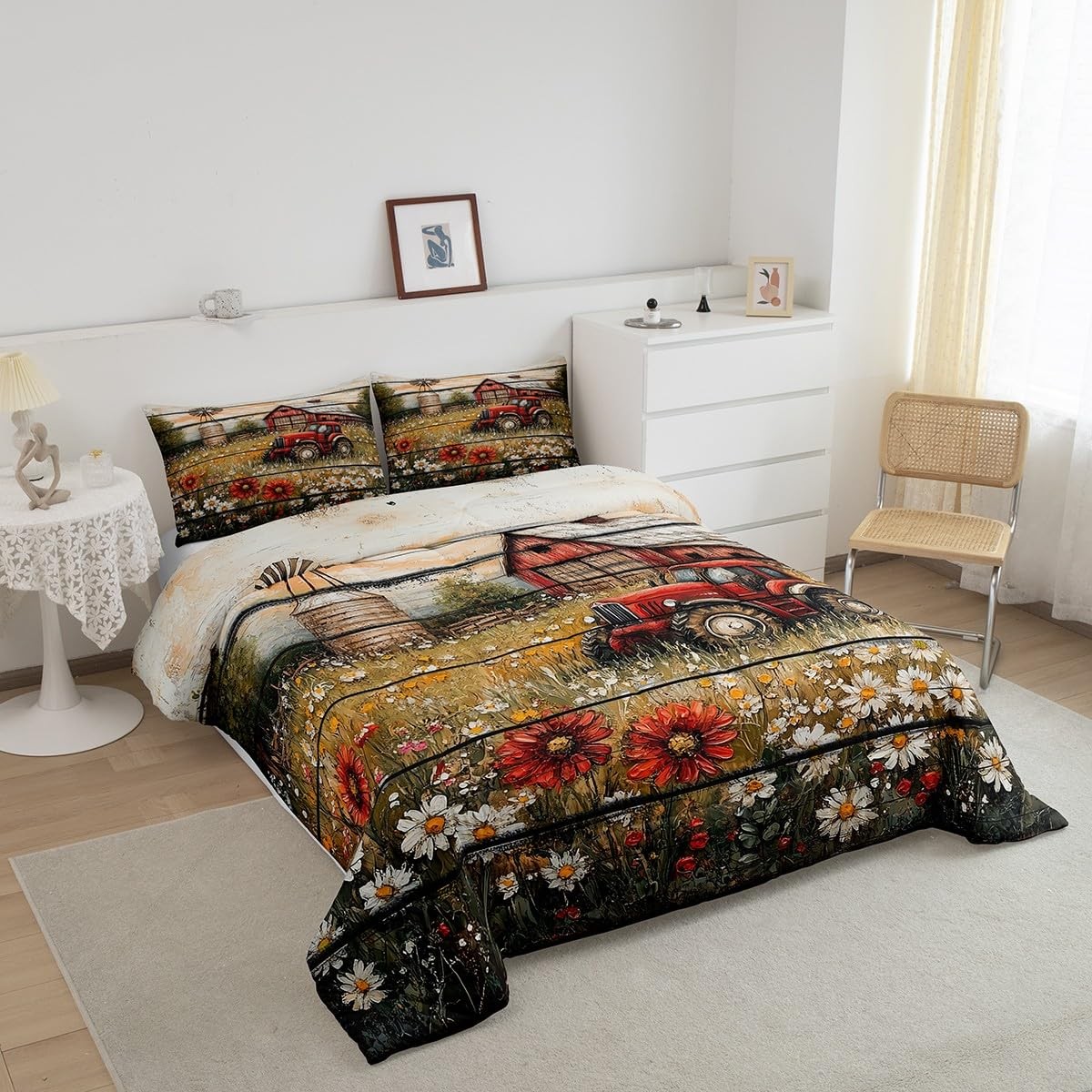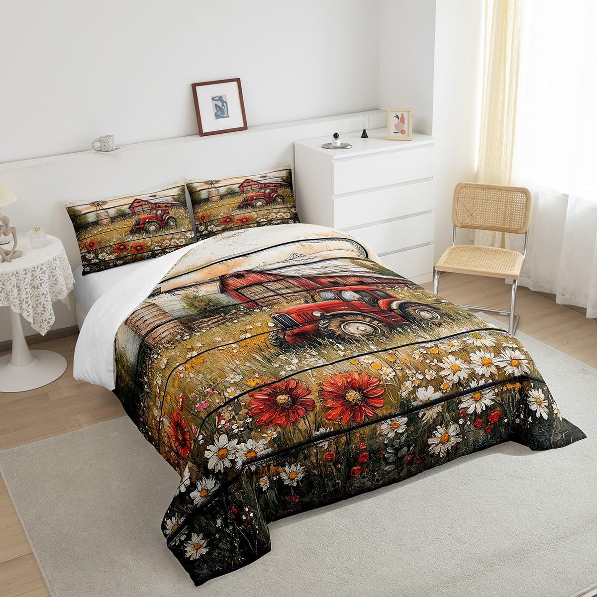Farmhouse Style Bedding Set Queen Size Vintage Red Tractor Comforter Boys Gir...