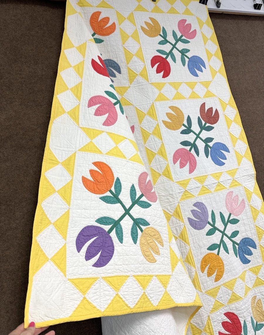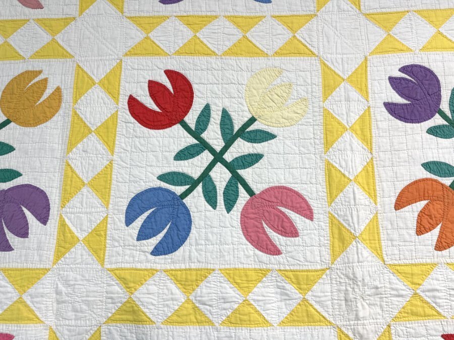 Delightful c 1940s Tulips QUILT Vintage Yellow Diamond Border