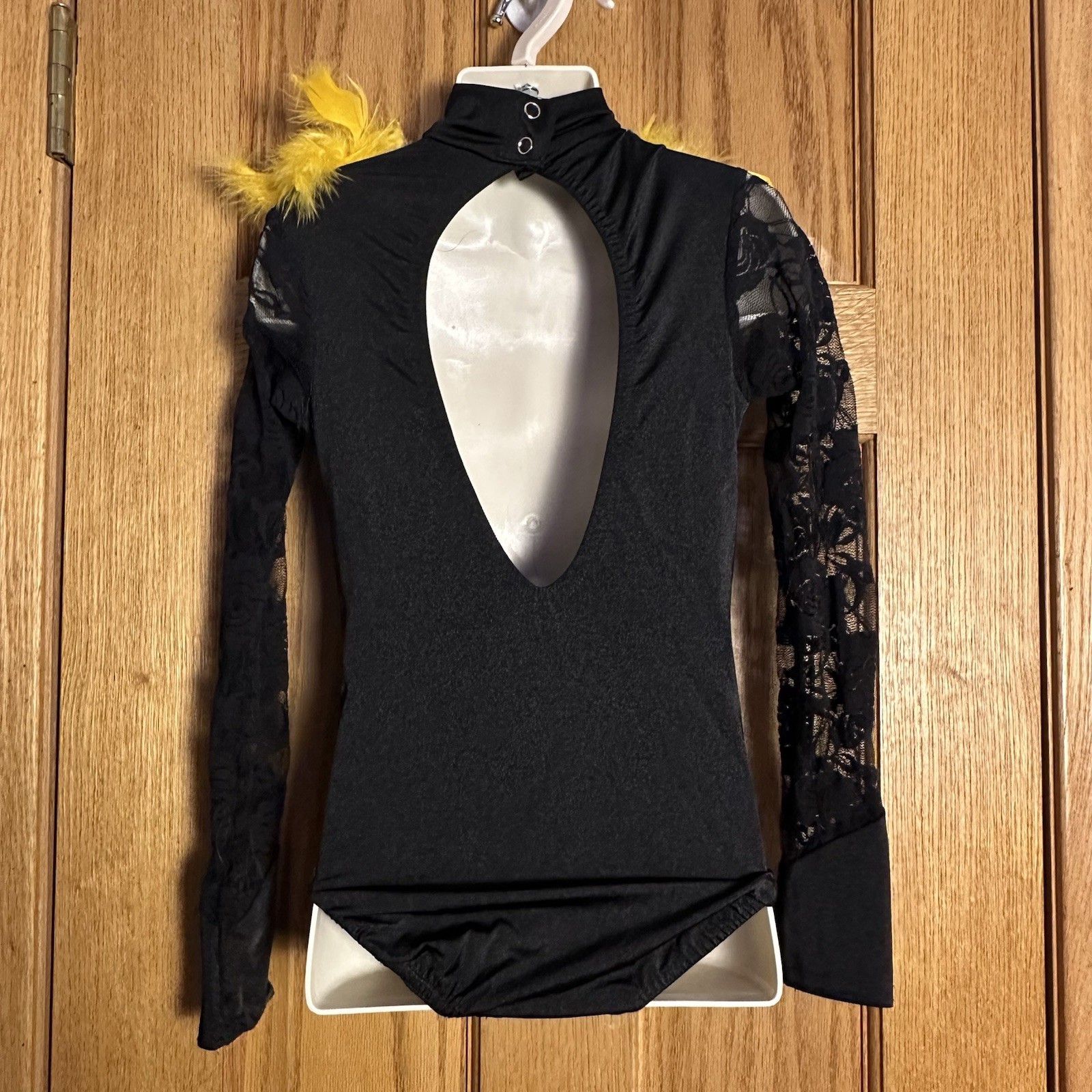 как выглядит Kelle Company Yellow Black Lace Long Sleeve Feathers Leotard Dance Costume SC фото