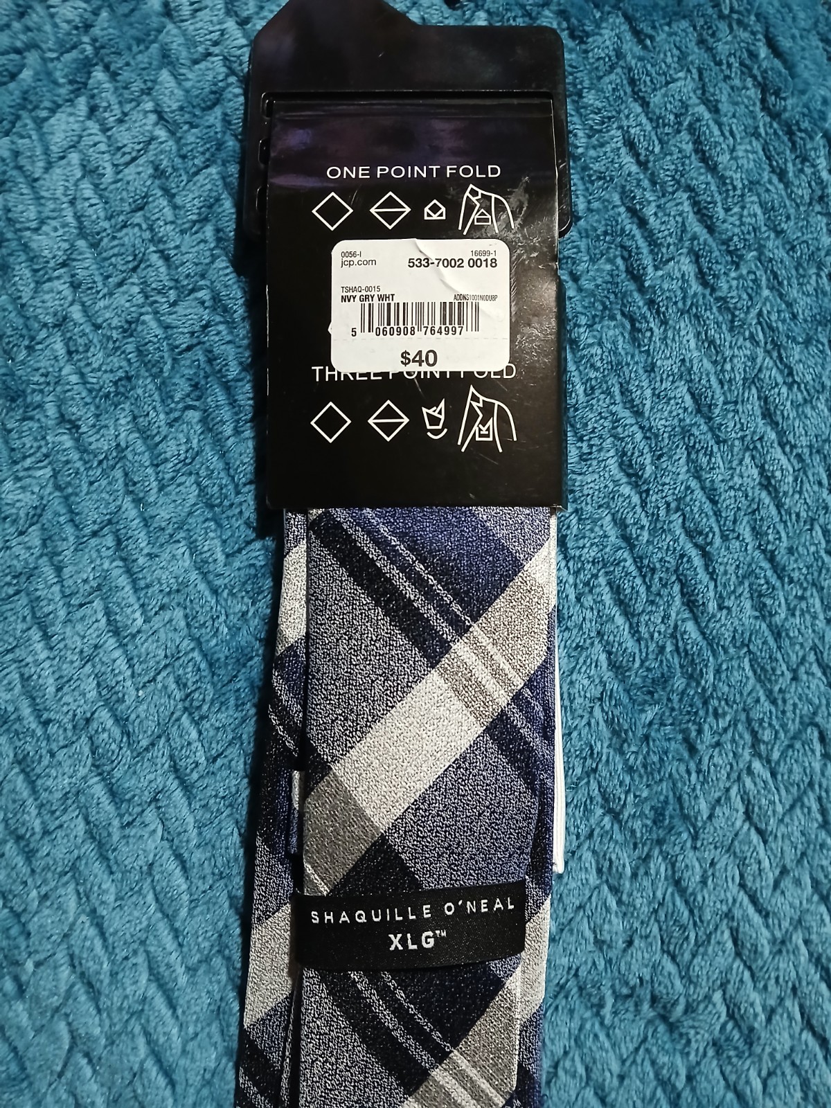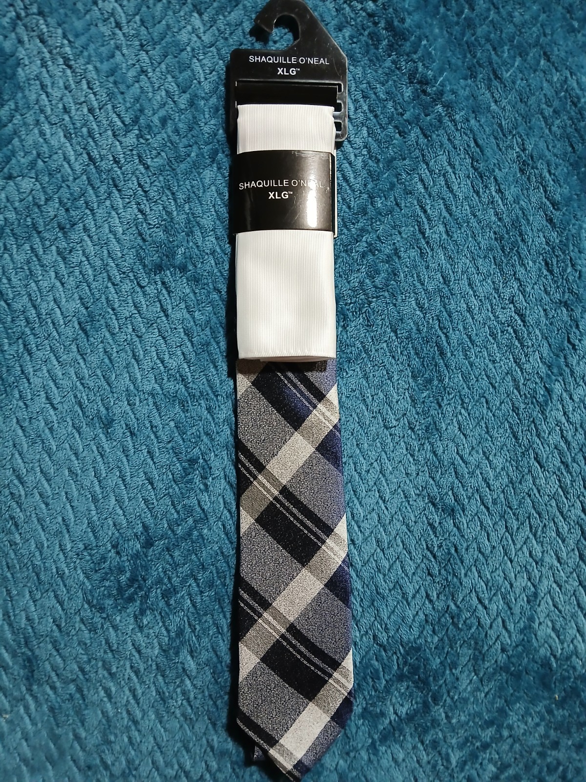 SHAQUILLE O'NEAL XLG Men's Navy Gray White Plaid Tie with White Hankie SET
