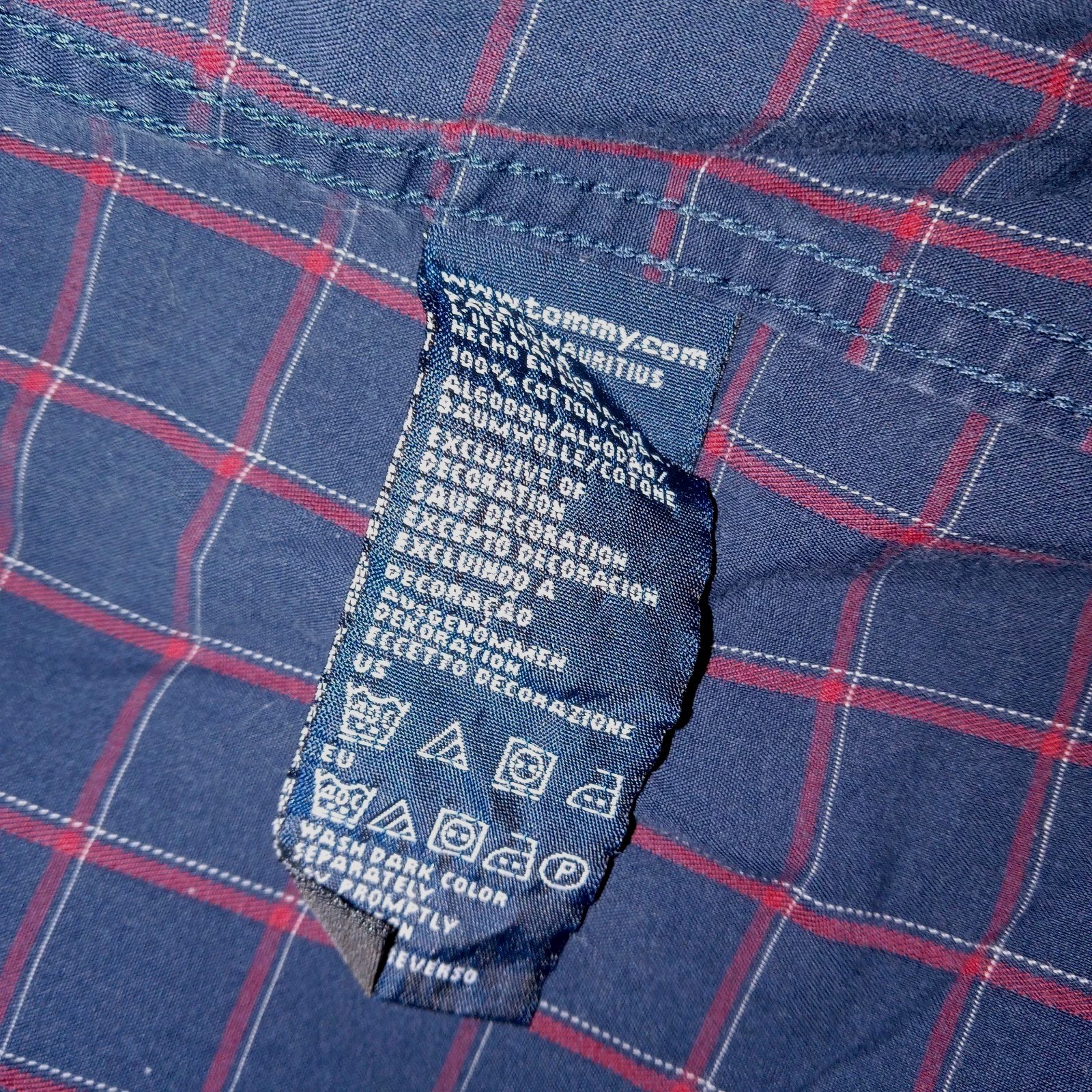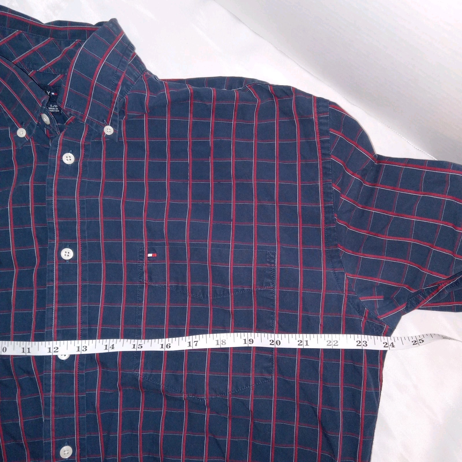 Tommy Hilfiger Shirt Mens Large Navy Blue Check Button Down Short Sleeve Logo