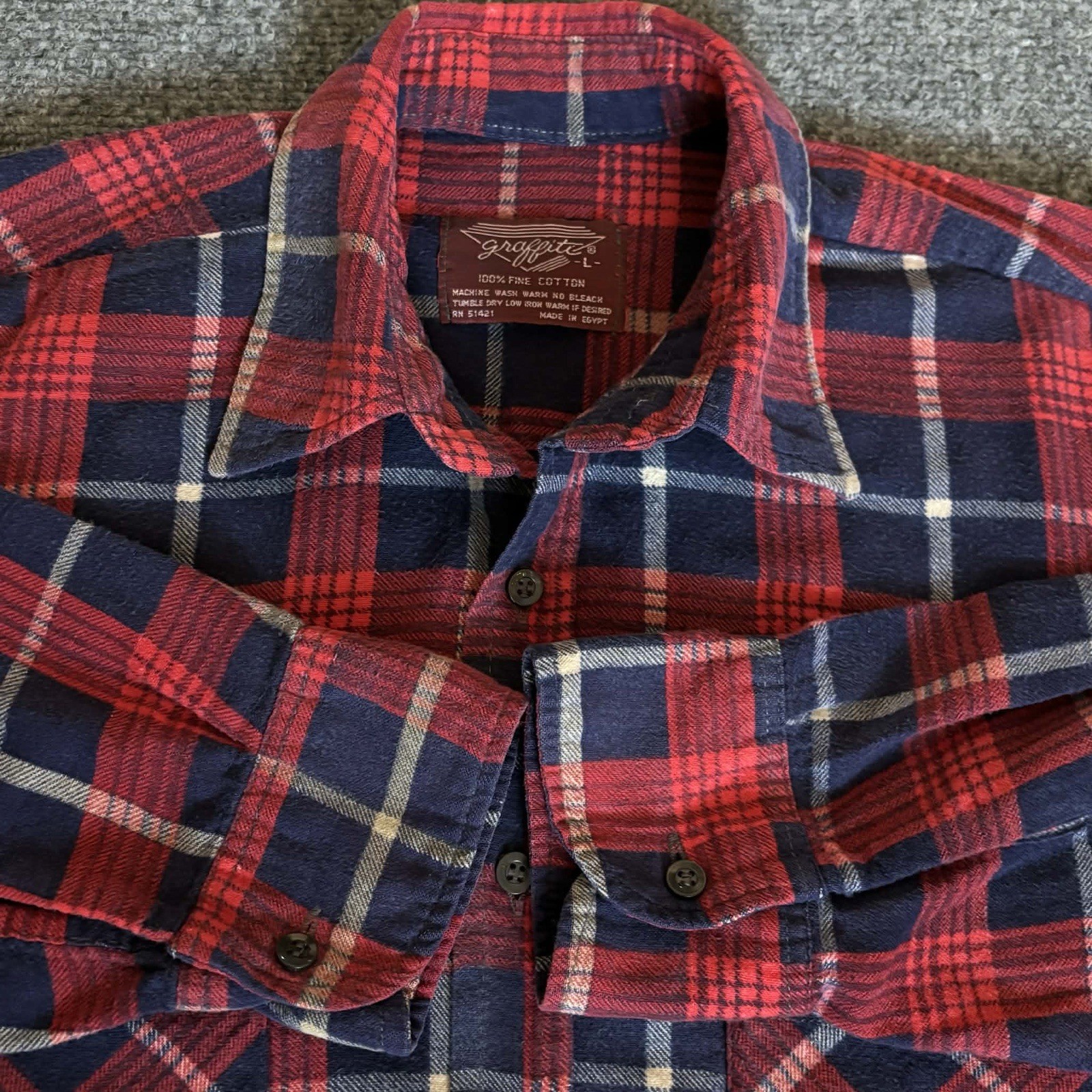 Vintage Men s Large Graffiti Red Plaid Flannel Button Up Shirt Made in Egypt