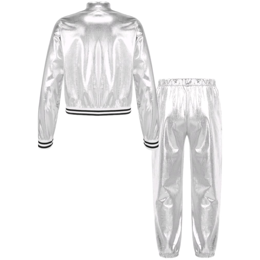 Kids Boys Girls Hip Hop Dance Costumes Shiny Bomber Jacket Pants Silver Size 6