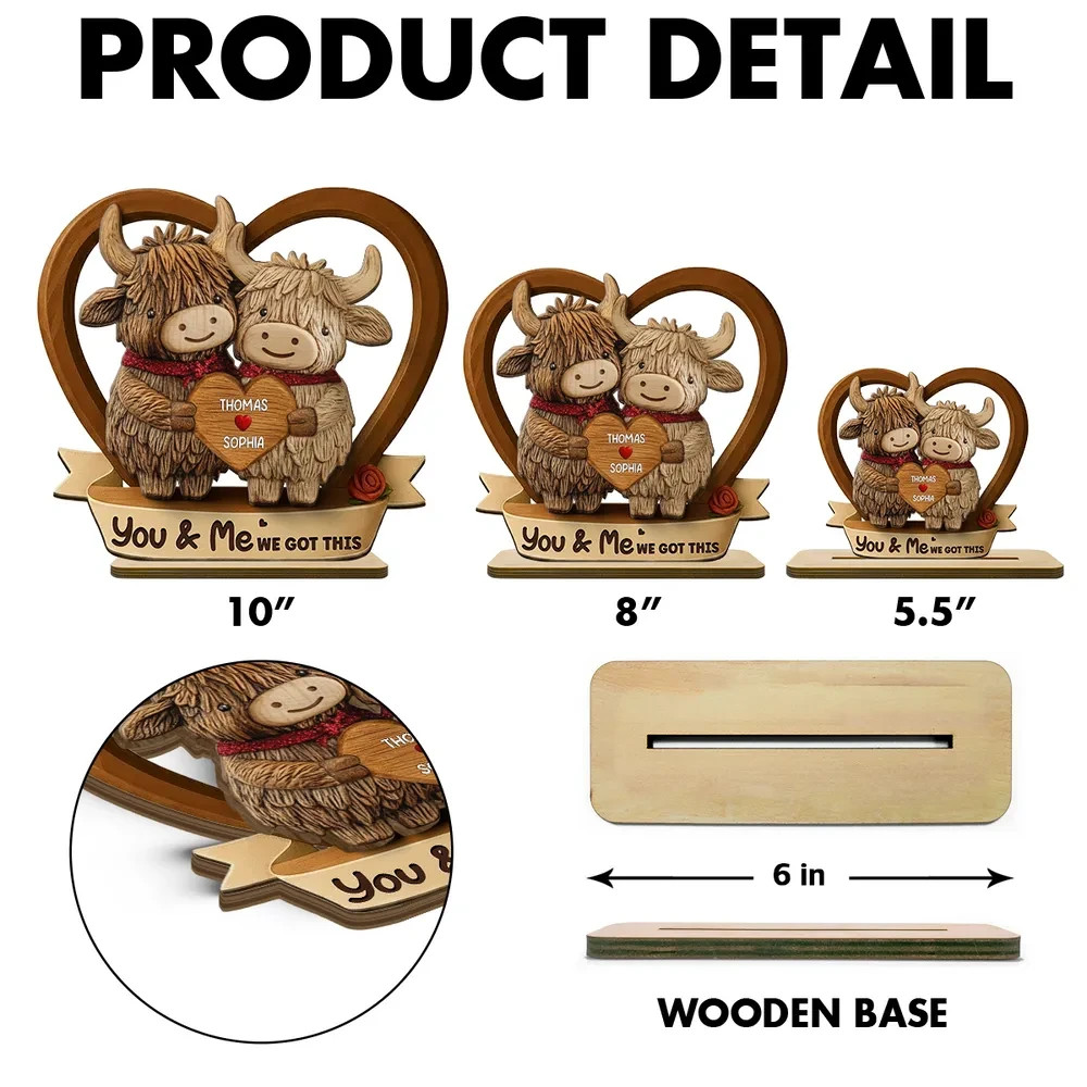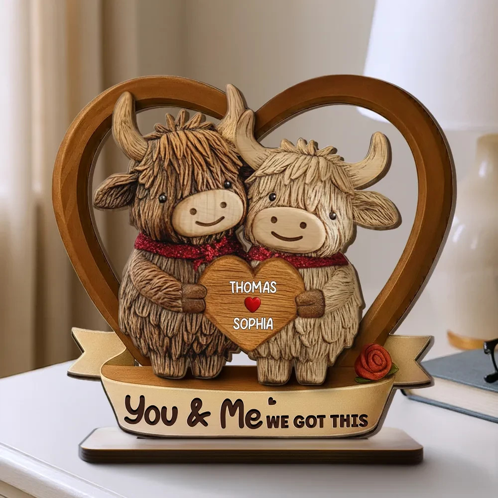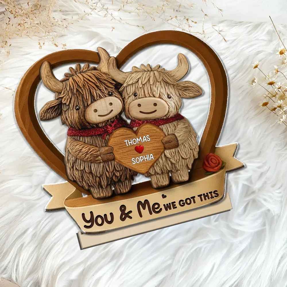 3D Highland Cows Couple Heart Personalized 2-Layer Wooden Plaque Valentine G