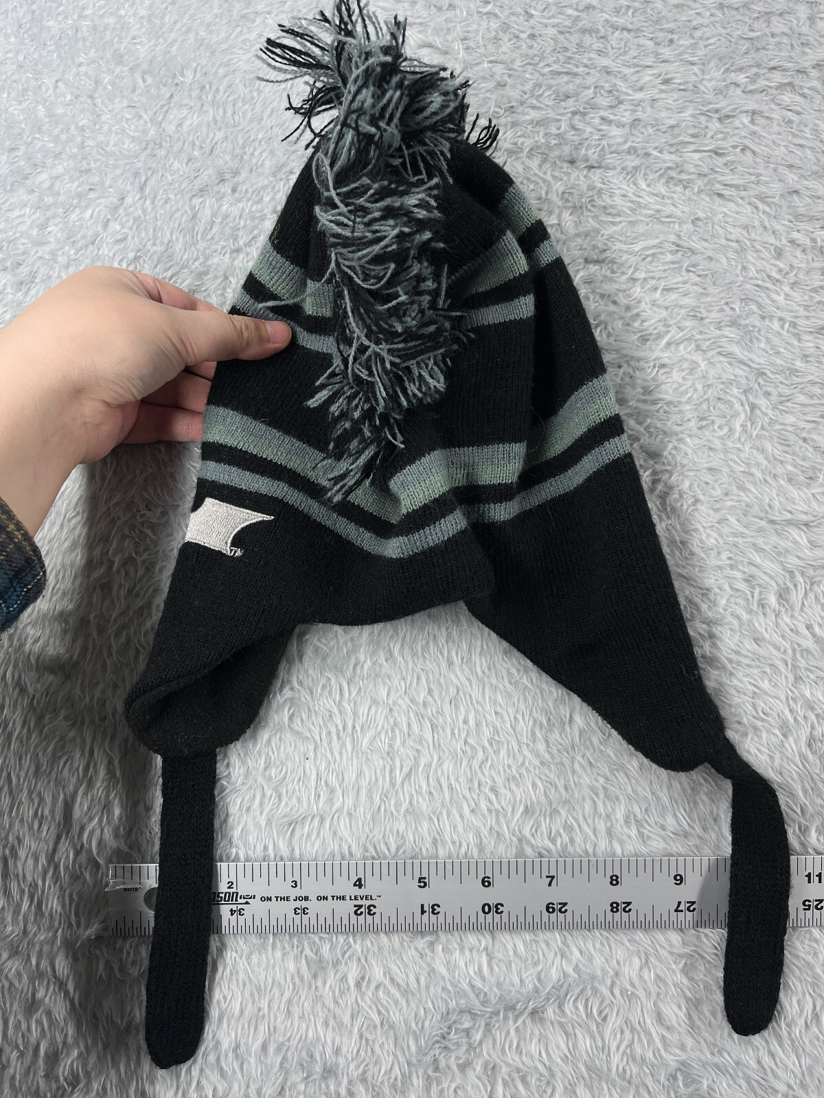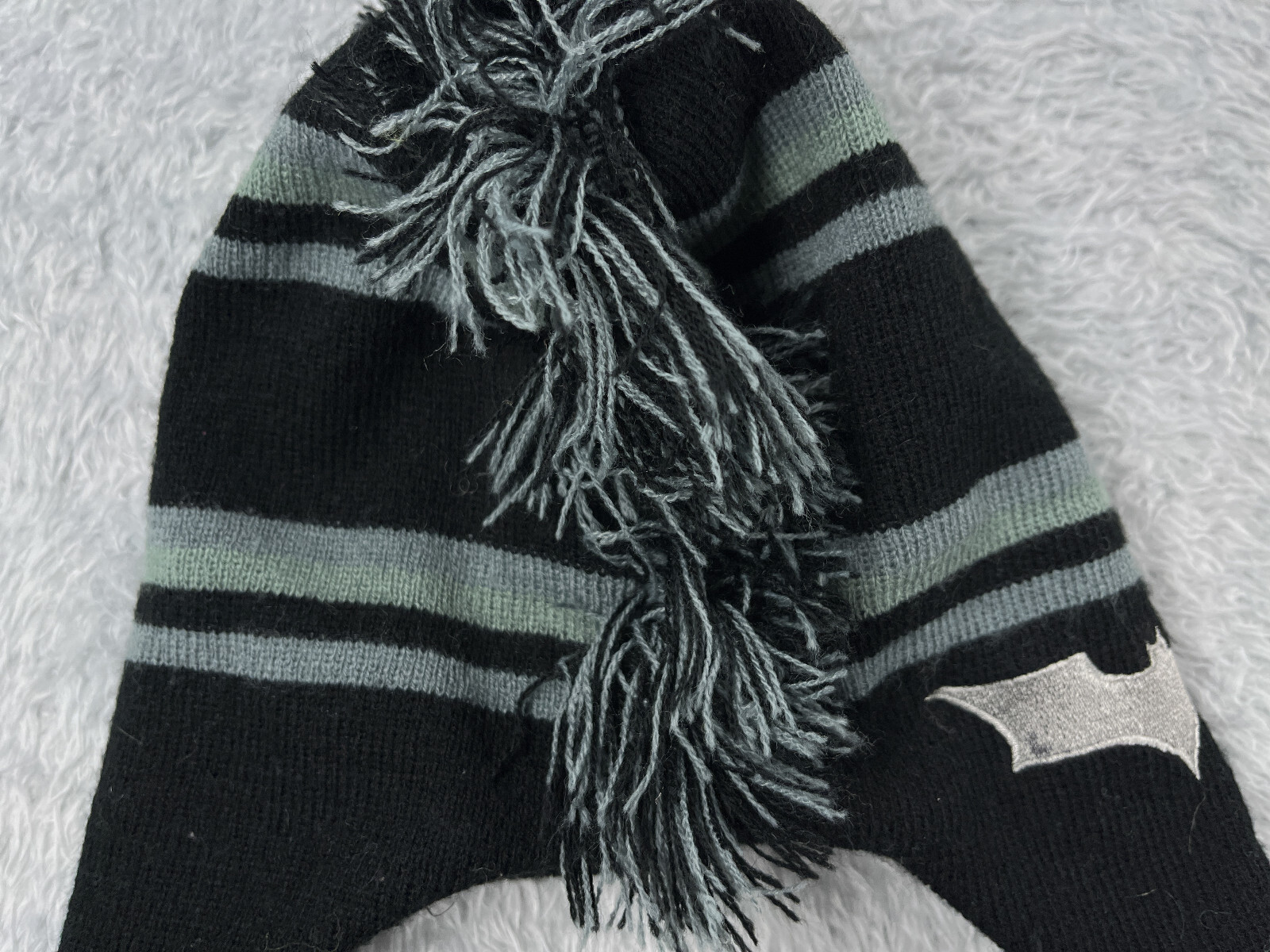 как выглядит Batman Beanie Toque Youth Black Gray Striped Knit Ear Flaps Lined Acrylic Poly фото