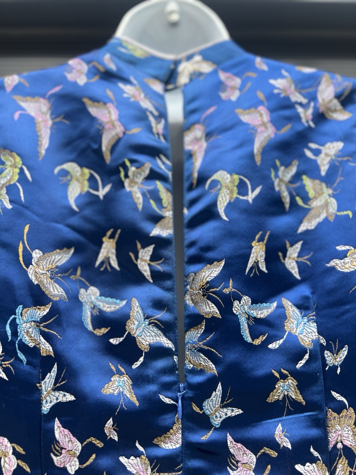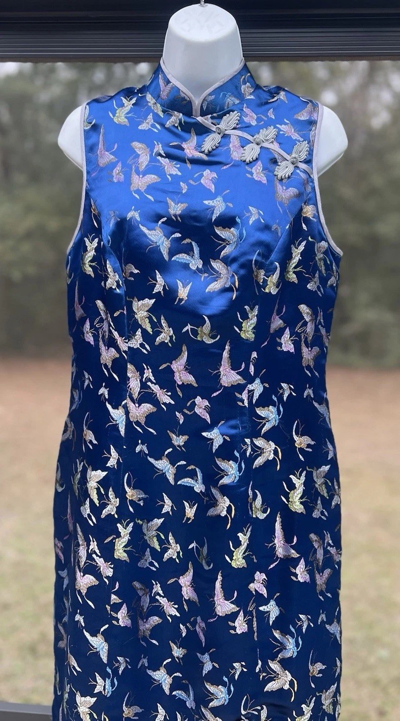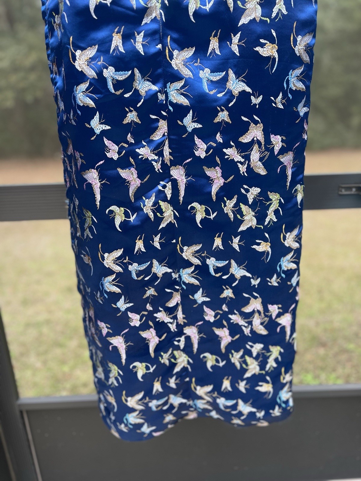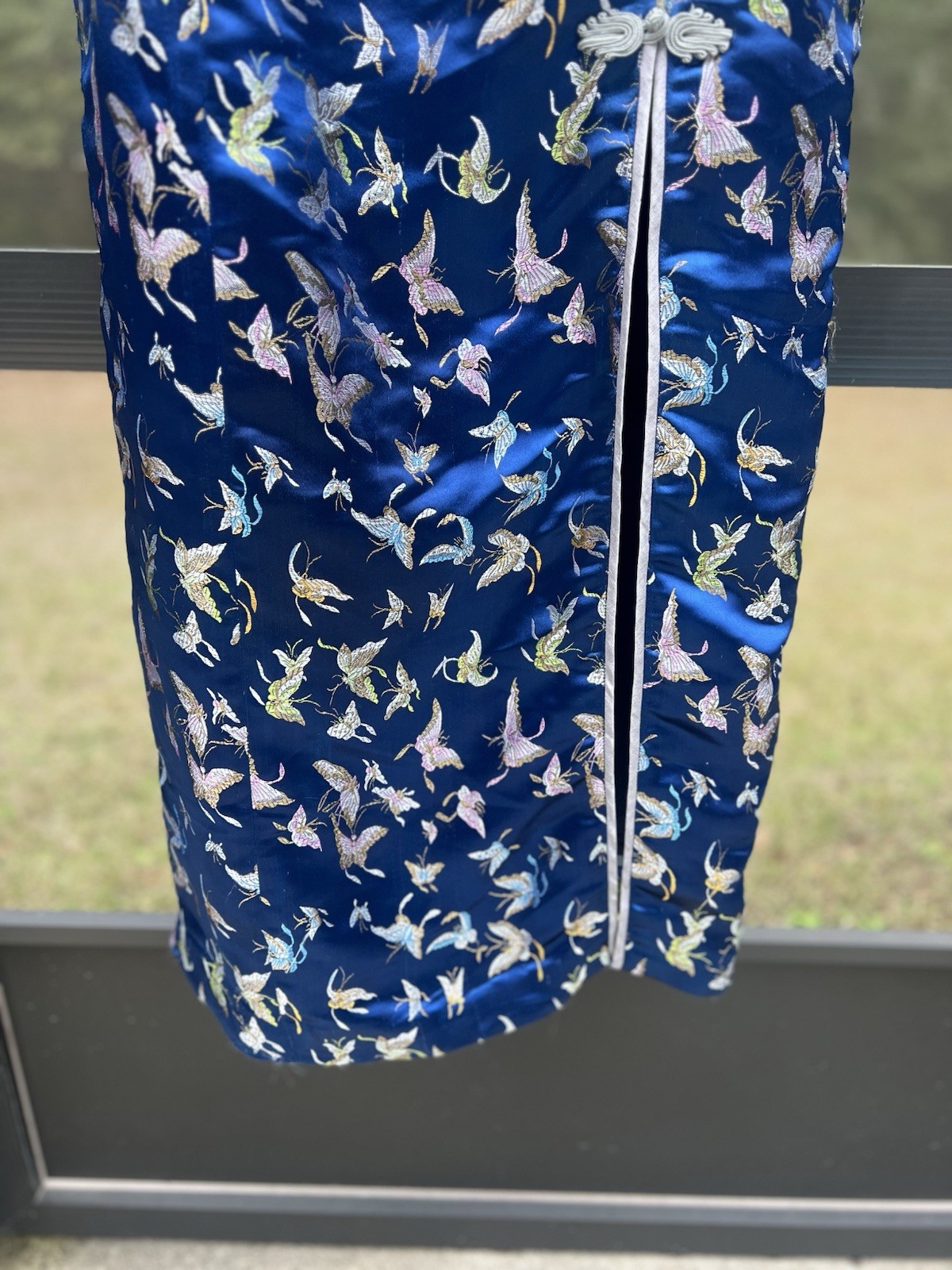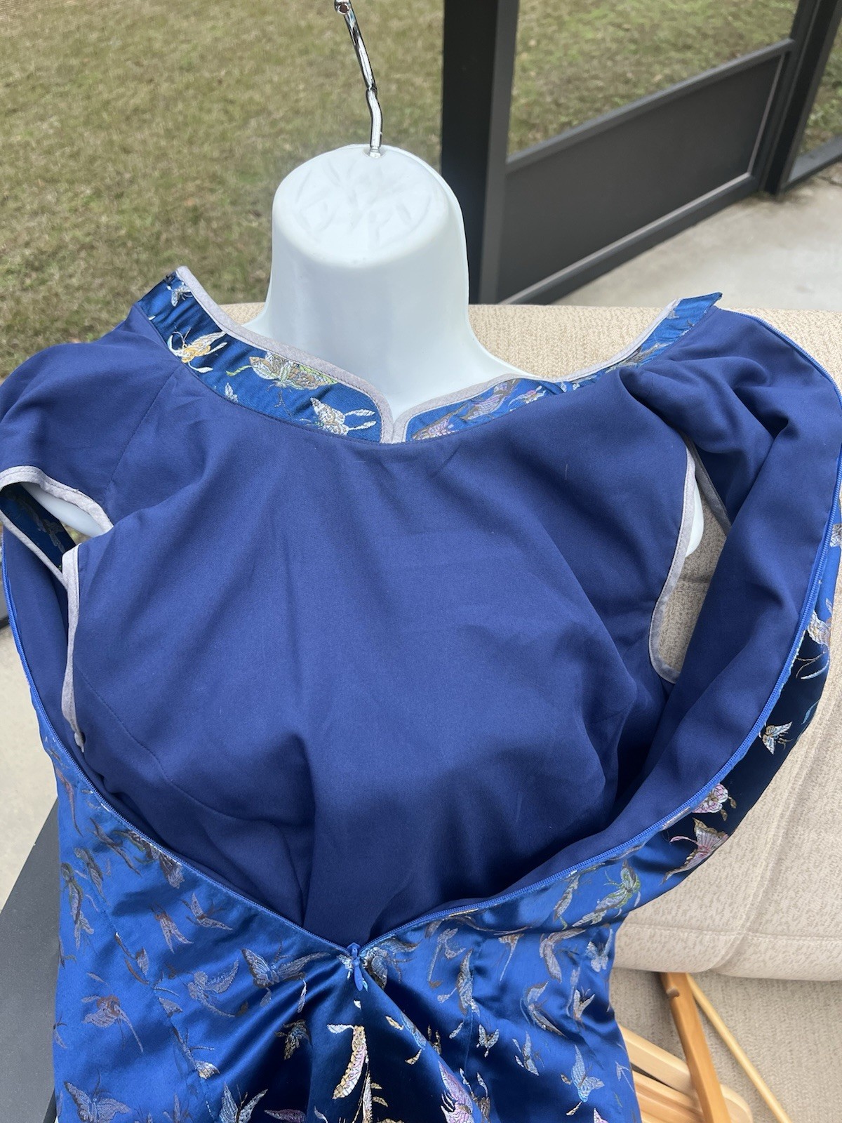 Blue Brocade Cheongsam Qipao Dress Mandarin Collar Frog Closures Lined