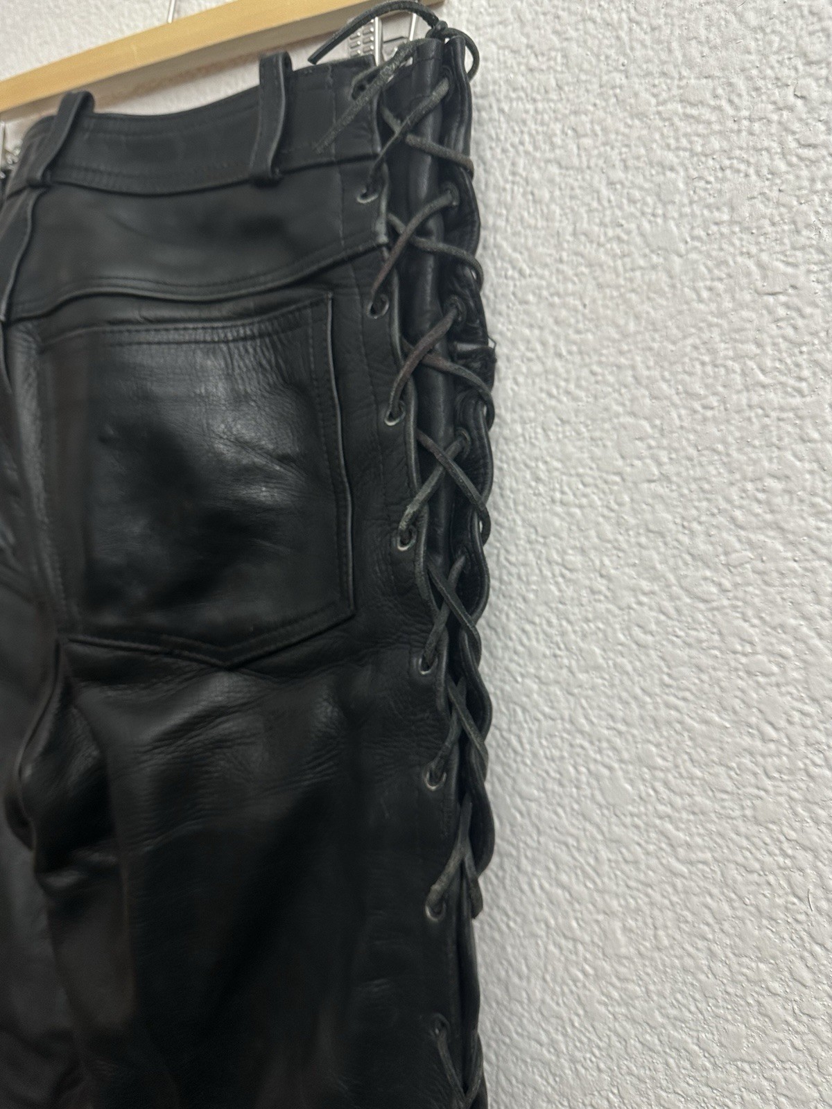 как выглядит VTG Indian Angel Black Leather Lace Up Motorcycle Pants Womens Lined Biker 90s фото