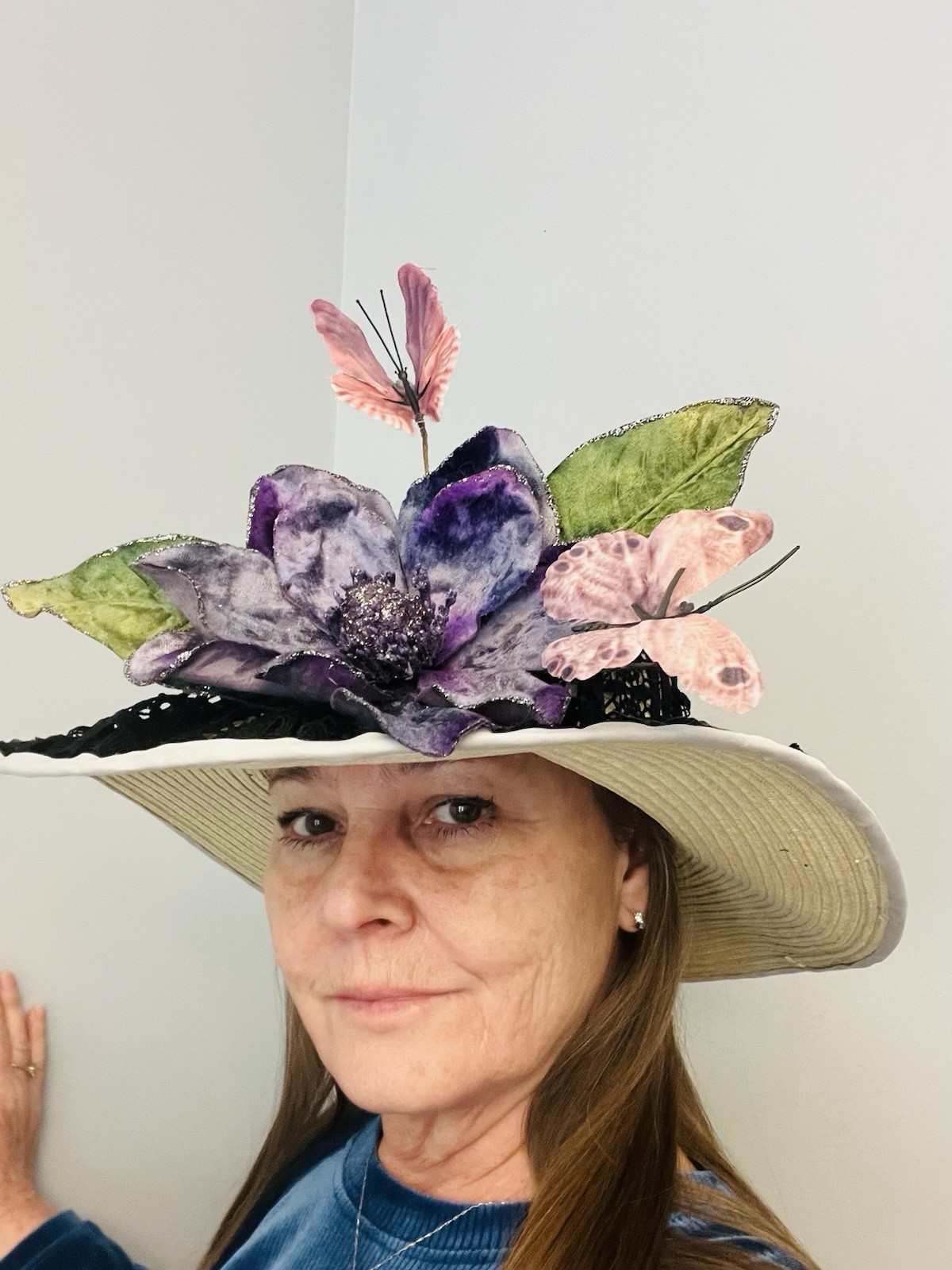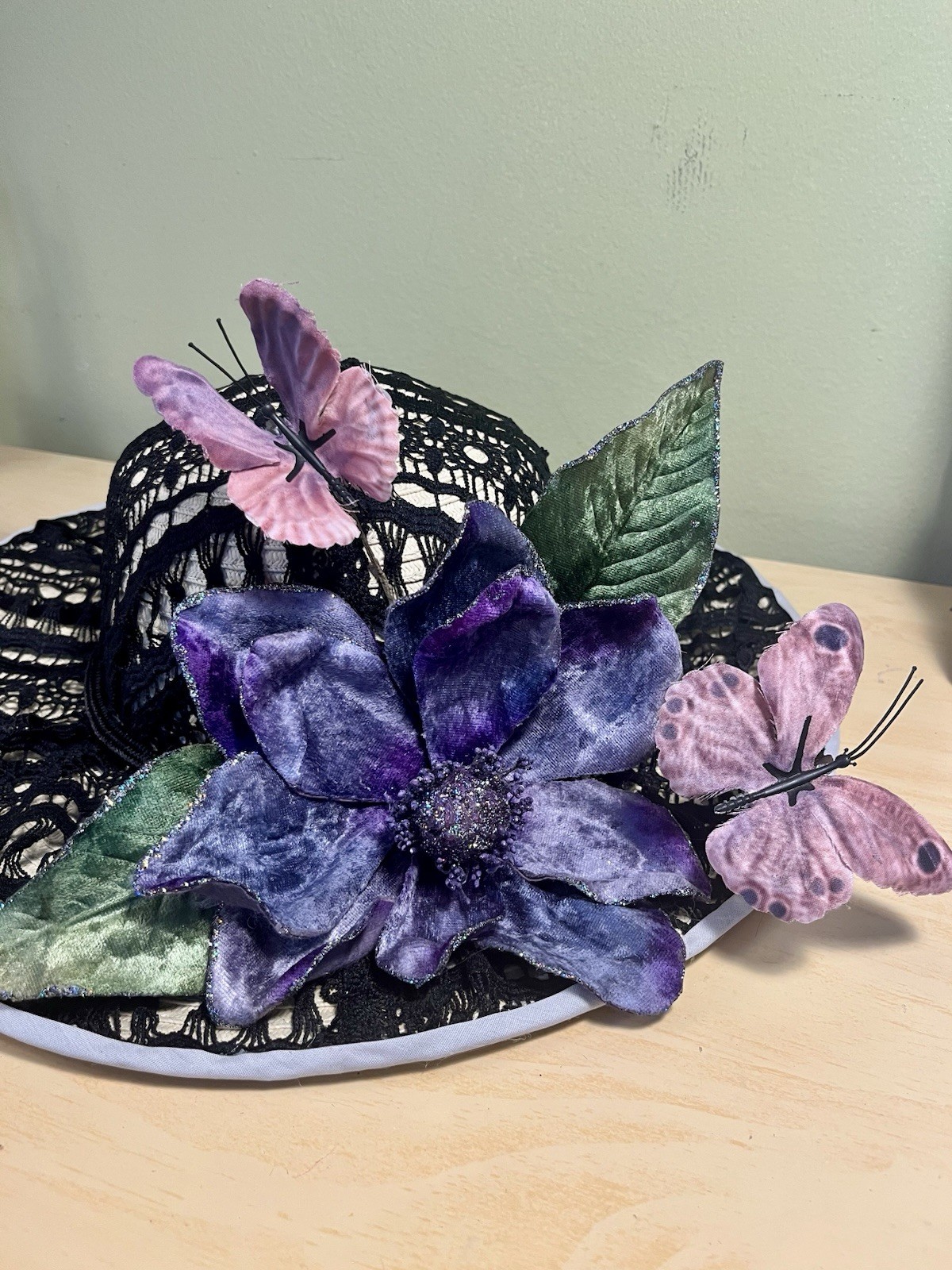 Hat Derby Women s Black OOAK Handmade Purple Sparkly Flower Pink Butterflies New