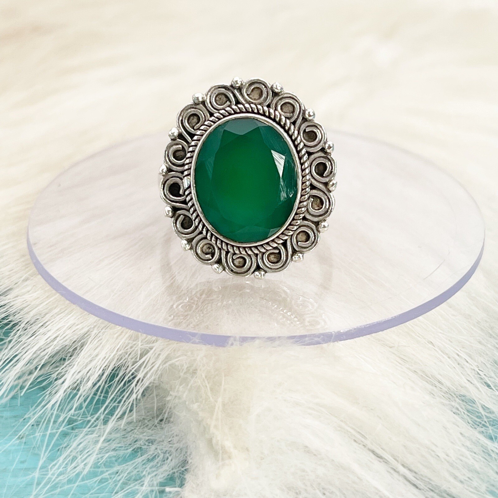 Sterling Silver Faceted Green Stone Ring Large Oval 925 Statement Sz 6 1/2